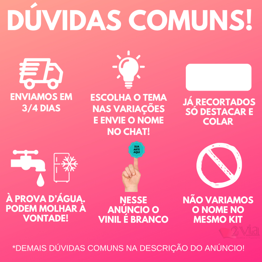 150 Etiquetas Adesivo Escolar PARA MENINOS Com 3 Medidas A Prova D'água Personalizada Com Recorte 🚨ENVIE O NOME NO CHAT O QUANTO ANTES.🚨 Caso não envie, enviaremos com espaço em branco para escrever à caneta! ✅Nesse kit contém: 100 etiquetas 1x4cm para lápis 30 etiquetas 5x2,5 para cadernos, borrachas etc 20 etiquetas 8x4cn para potes, livros e garrafas ✅Diferencial do nosso produto: ✔ Adesivo impresso em vinil branco ✔ Ótima qualidade ✔ Alta durabilidade ✔ Enviamos 3 a 4 dias após o envio da arte ✔ Ideais para cadernos, lápis, potes, garrafas e muito mais ✔ Todos os nossos adesivos já são entregues recortados, prontos para destacar e colar ✔ Não desbotam, não rasgam, podem molhar, lavar, ir ao micro-ondas, congelar, colar em potes etc. ✔ Adesivos impressos em vinil e já recortados, prontos para destacar e colar em qualquer superfície lisa ✅Como personalizar: ✔ 1: Escolha o desenho que deseja nas variações ✔ 2: Envie o nome no chat ✔ 3: colocaremos em produção assim que recebermos o nome ✅Avisos e Cuidados: ✔ Não variamos dentro do mesmo kit ✔ Não imprimimos, prateado, dourado ou tinta cor branca pois o processo de produção é diferente! Dourado vai sair amarelo ouro e prateado acinzentado. Branco só em fundos brancos, no transparente não sai branco 🚚 Envio Super Rápido 🥰 Para dúvidas, estamos à disposição no chat