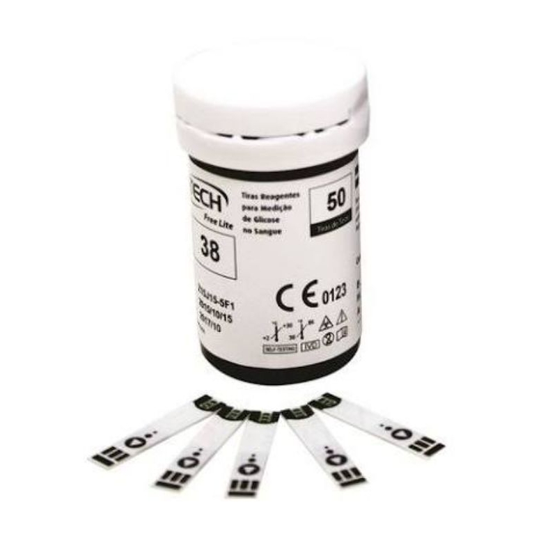 As fitas de glicemia G-Tech Lite utilizam a enzima GDH-FAD para maior precisão, dispensando codificação (AutoCode) e exigindo apenas de sangue. Com tecnologia Fast Draw para absorção rápida, fornecem resultados em 5 segundos, sendo compatíveis com os medidores G-Tech Lite Especificações Técnicas Detalhadas: Enzima: GDH-FAD (elimina interferentes como oxigenoterapia e outros açúcares). Tempo de Teste: 5 segundos. Volume de Amostra: 0,6 microlitros (0,9 em alguns modelos). Faixa de Resultado: Calibração: Equivalente ao plasma. Tecnologia: Fast Draw (aproveitamento total e rápido da amostra). Codificação: Automática (AutoCode). Compatibilidade: Exclusivo para medidores G-Tech Lite e Lite Smart. Uso: Sangue total capilar, arterial ou venoso Recomendações: Temperatura de uso: 10°C - 40°C Armazenamento: Local seco, temperatura entre, longe da luz solar direta. Validade: Deve-se verificar o prazo após aberto, com aviso de vencimento de tiras