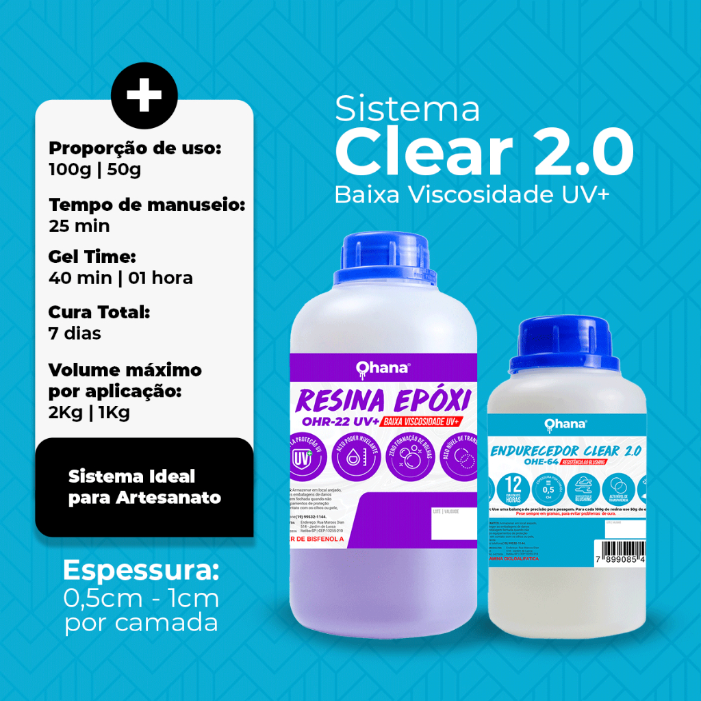 NOVO SISTEMA CLEAR 2.0 - um sistema com maior resistência ao BLUSHING e imperfeições no filme (CASCA DE LARANJA). - Resina Epóxi Baixa Viscosidade OHR-22 UV+ (100g) com Endurecedor Clear 2.0 OHE-64 (50g). Total de mistura: 150g O Sistema Clear 2.0 é composto pela resina epóxi e endurecedor. Resina Epóxi (OHR-22UV+) • BAIXA VISCOSIDADE 100% epóxi, mais líquida com aspecto semelhante a água. Por conter tripla proteção ULTRA VIOLETA esta resina foi especialmente formulada para aplicações de peças que necessitam de uma maior proteção retardando o amarelecimento precoce. Outras características são: alta transparência, alta resistência química e mecânica e sua alta capacidade autonivelante. Endurecedor (OHE-64) • É indicado para aplicações de peças pequenas com espessura máxima de 1cm por camada e para aplicações de peças médias e grandes com espessura máxima de 0,5cm por camada. Sua característica se dá pela resistência elevada ao BLUSHING e seu alto nível de transparência. INFORMAÇÕES DE USO: Proporção de uso: 100g resina / 45 ≤ 50g de endurecedor* Tempo de manuseio: 25 minutos Gel Time: 40 minutos / 1 hora Cura total: 7 dias (não molhar antes desse período) Volume máximo por aplicação: 2Kg resina + 1Kg endurecedor *Em dias úmidos reduza sua porcentagem de endurecedor para 45%. Garantia do vendedor: 24 meses