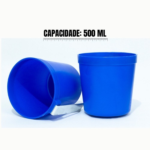 Canecas de plástico de 500 ml, com alça de metal. Indicado o vermelho para a ração, e o azul para a água. Uso ideal para aves em geral de médio a grande porte como codorna, garnisé, galinha, galo, papagaio, etc. Caneca feita de PP pigmentado de azul e vermelho. Alça feita de ferro galvanizado.
