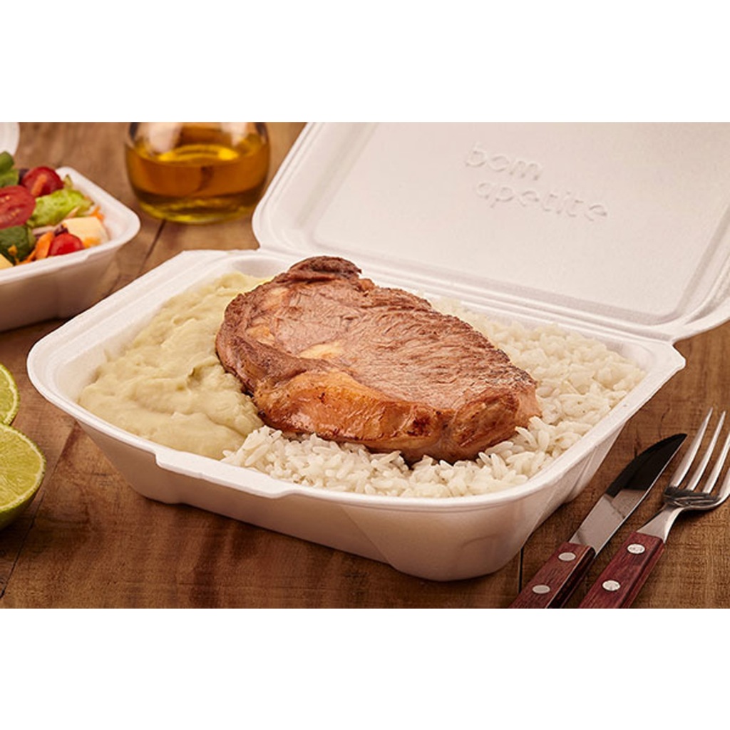 Para acomodar alimentos como Hambúrgueres, Sanduíches, Lanches, Refeições, Porções, Batatas Fritas, Salgadinhos, Petiscos, Saladas, Fatias de Bolos, Tortas, Doces, Sobremesas e Outros. Usada em entregas delivery nas Hamburguerias, Lanchonetes, Bares, Restaurantes, Pastelarias, Petiscarias, Panificadoras e Docerias. Prática de usar com fechamento fácil, proporciona mais resistência, segurança, higiene e mantém por mais tempo a temperatura dos alimentos. O Kit é composto por 16 Estojos Brancos de Isopor BH-101 Capacidade: 1300ml Altura: 70mm Largura: 225mm Profundidade: 169mm Material: Poliestireno Expandido (Isopor) Especificações da Caixa de Embarque B: Tamanho 24x13x36cm / Peso 0,5Kg Garantia de 90 dias contra defeitos de fabricação