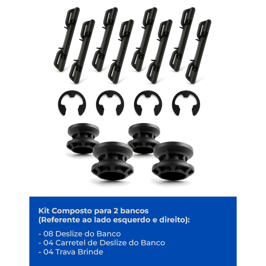 Kit com 16 peças (Deslize do Banco/Carretel de Deslize do Banco): Composição: - 08 Deslize do Banco - 04 Carretel de Deslize do Banco - 04 Trava do Carretel Kit Contendo todas as peças necessárias para troca de 2 bancos Compatível com veículos: Elba (85/04) Fiorino (85/13) Palio (96/15) Siena (96/15) Premio (85/96) Uno (85/13) Strada (96/15) Palio Weekend (96/15) Garantia de fábrica: 30 dias