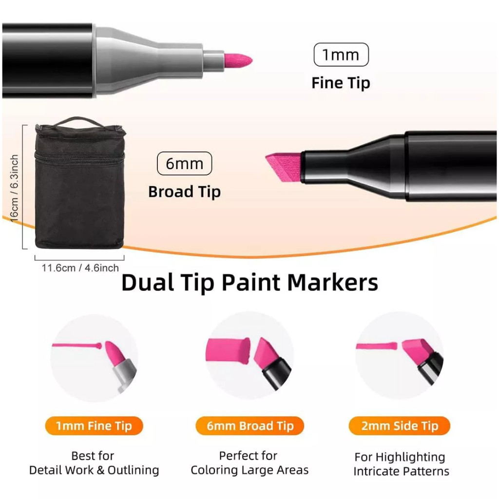 Marcadores Artísticos Permanentes com Dupla Ponta – Qualidade Profissional para Todas as Idades Versatilidade para Todas as Artes Marcadores profissionais ideais para pintura, escrita, desenho, ilustração, design, renderização, quadrinhos, animação e livros de colorir para adultos. Inclui uma ampla gama de cores vibrantes, armazenadas em uma prática caixa organizadora. ️ Dupla Ponta para Máxima Criatividade Ponta Fina (Bala): Para traços precisos, contornos e detalhes delicados. Ponta Chanfrada (Chisel): Para preenchimentos, sombreamentos e linhas mais largas. Perfeito para criar linhas grossas, finas ou limpas com facilidade e total controle. Tinta de Alta Qualidade e Fácil Mistura Cores ricas e intensas, com saturação uniforme. Mistura suave para transições naturais sem manchas ou falhas. Secagem rápida e à prova d’água, garantindo durabilidade da sua arte. Tinta não tóxica, livre de ácido e ecológica, segura até para crianças. Diversão Criativa sem Limites Perfeito para: Livros de colorir (mandalas, paisagens, personagens) Quadrinhos, grafite e ilustrações Caligrafia e scrapbooking Cartões artesanais, vinhetas e design criativo Com esses marcadores, artistas de todas as idades podem explorar sua imaginação com facilidade. Também é um presente ideal para iniciantes, entusiastas, criadores de quadrinhos e amantes das cores. Identificação Rápida das Cores Cada marcador possui código ou nome da cor para fácil identificação. Tampas correspondem exatamente à cor da tinta. Organizados para que você encontre a cor desejada em segundos. Seguro e Confiável Produzido com materiais de alta qualidade e certificação internacional. Seguro para crianças acima de 3 anos. Resistente à luz e sem desbotamento com o tempo. Dicas de Uso: Indicado para crianças a partir de 3 anos. Sempre feche bem a tampa após o uso para evitar evaporação da tinta. As cores podem apresentar pequenas variações dependendo da tela ou iluminação. Armazene em local fresco, longe da luz solar direta. Transforme suas ideias em arte com marcadores que combinam qualidade profissional e praticidade!