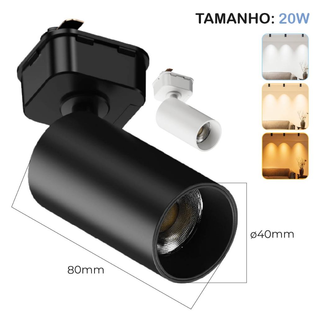 1M Trilho + 4 Spot LED 20W 15W 10W 7W Eletrificado + Trilho Tubinho Preto e Branco Luz Fria, Neutra e Quente Bivolt