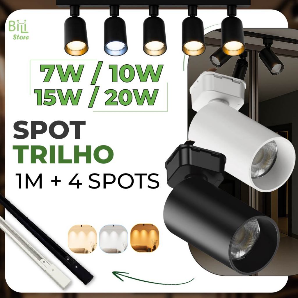 1M Trilho + 4 Spot LED 20W 15W 10W 7W Eletrificado + Trilho Tubinho Preto e Branco Luz Fria, Neutra e Quente Bivolt