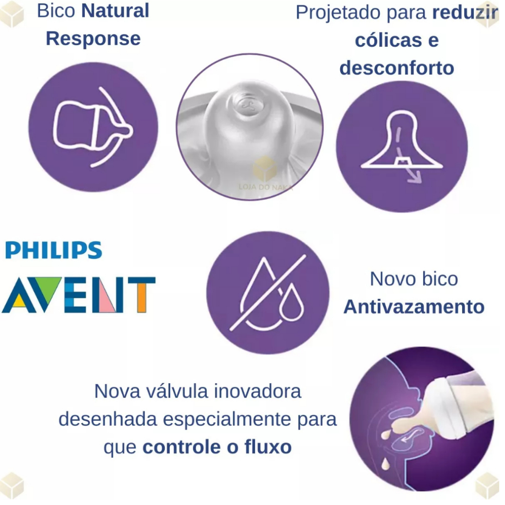 A maior vantagem da amamentação é o momento entre mãe e filho, o contato com o bebê é único, sem falar nas inúmeras vantagens que o leite materno proporciona para os pequenos. A OMS recomenda o aleitamento materno exclusivo até os seis meses e a continuidade até os dois anos com introdução de outros alimentos. Pensando nisso a Philips trouxe a mamadeira pétala que conta com um design de espiral interno, sendo mais flexível. Facilita amamentação entre o seio e a mamadeira. Bico Natural Response que possui a válvula desenhada especialmente para que o bebê controle o fluxo. Única válvula capaz de interromper totalmente o fluxo quando o bebê para de sugar. O bico Natural Response funciona com o fluxo e ritmo individualizado para cada bebê. Bico Anti-gotejamento. A abertura do bico foi desenhada para liberar leite apenas quando ativada. Bico flexível e macio. Descrição do produto Faixa etária: 260 ml = Bico tamanho 3 (Indicado a partir de 1 a 3 meses) Composição Bico: Silicone Fluxo: Rápido A embalagem contém: 1 Mamadeira Pétala Avent 3.0 Bisfenol: Produto certificado - BPA FREE / Livre de bisfenol A*,Polipropileno O Ministério da Saúde adverte: A criança que mama no peito não necessita de mamadeira, bico ou chupeta. O uso de mamadeira, bico ou chupeta prejudica o aleitamento materno'.
