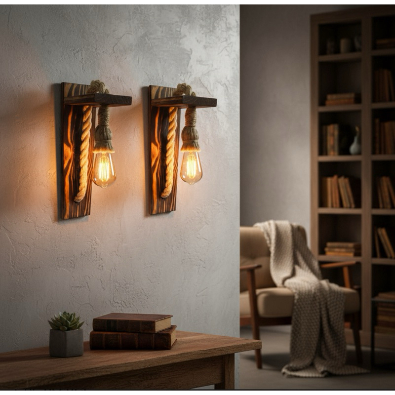 2 Arandelas de Parede Rústicas Retrô em Madeira e Corda Sisal