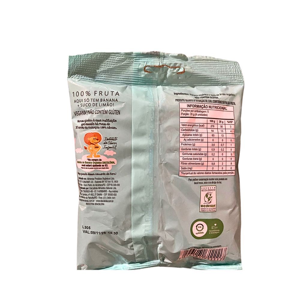 2 PACOTES BALA DE BANANA ORGÂNICA ZERO AÇÚCAR DACOLONIA 100G - DACOLÔNIA Zero adição de açúcares Produto Orgânico Sem glúten Ingredientes: Banana orgânica e suco de limão orgânico. Alérgenos: Não contém glúten. Validade: 12 meses a partir data de fabricação.