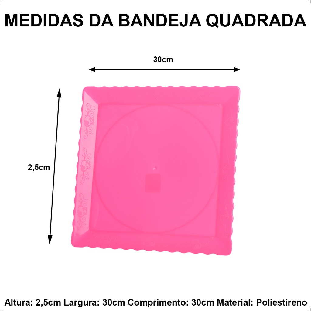 A bandeja que você precisa para a decoração da sua festa está aqui! Vai fazer uma festa ou comemorar uma data especial e quer que fique tudo lindo? A bandeja quadrada é indispensável como decoração de mesa, usado para servir doces, salgados e outros alimentos que dão água na boca. Contém 2 unidades: Bandeja Quadrada. Especificações técnicas: BANDEJA QUADRADA Comprimento: 30 cm Altura: 2,5 cm Largura: 30 cm Material: Poliestireno Qualidade e durabilidade: A bandeja é utilizada para decorar a mesa de todos os temas, que promete qualidade e praticidade. Um produto excelente que atende perfeitamente as necessidades do cliente. Entrega: Nós temos como obrigação garantir que os produtos de nossos clientes cheguem ao destino final intacto e em perfeitas condições. Produtos à pronta entrega. Envio rápido e seguro. Embalagens protegidas e reforçadas. Caso tenha a opção cor misto, por gentileza, ao finalizar a sua compra, informar imediatamente ao nosso atendente as cores escolhidas através do chat. Agradecemos pela confiança depositada no nosso trabalho e pela preferência!