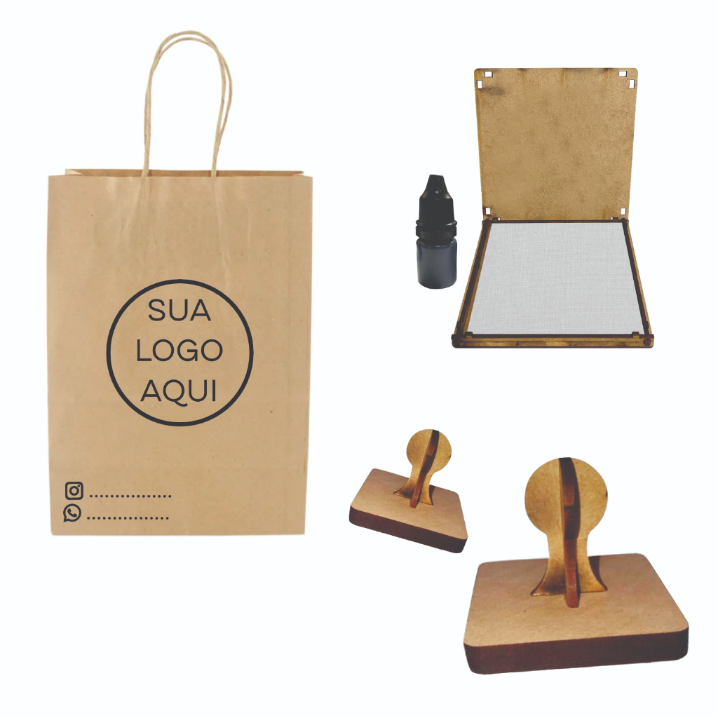 2 Carimbos - 5cm cada + almofada e tinta. Carimbo Personalizado Sacola Kraft Tecido Plástico Isopor