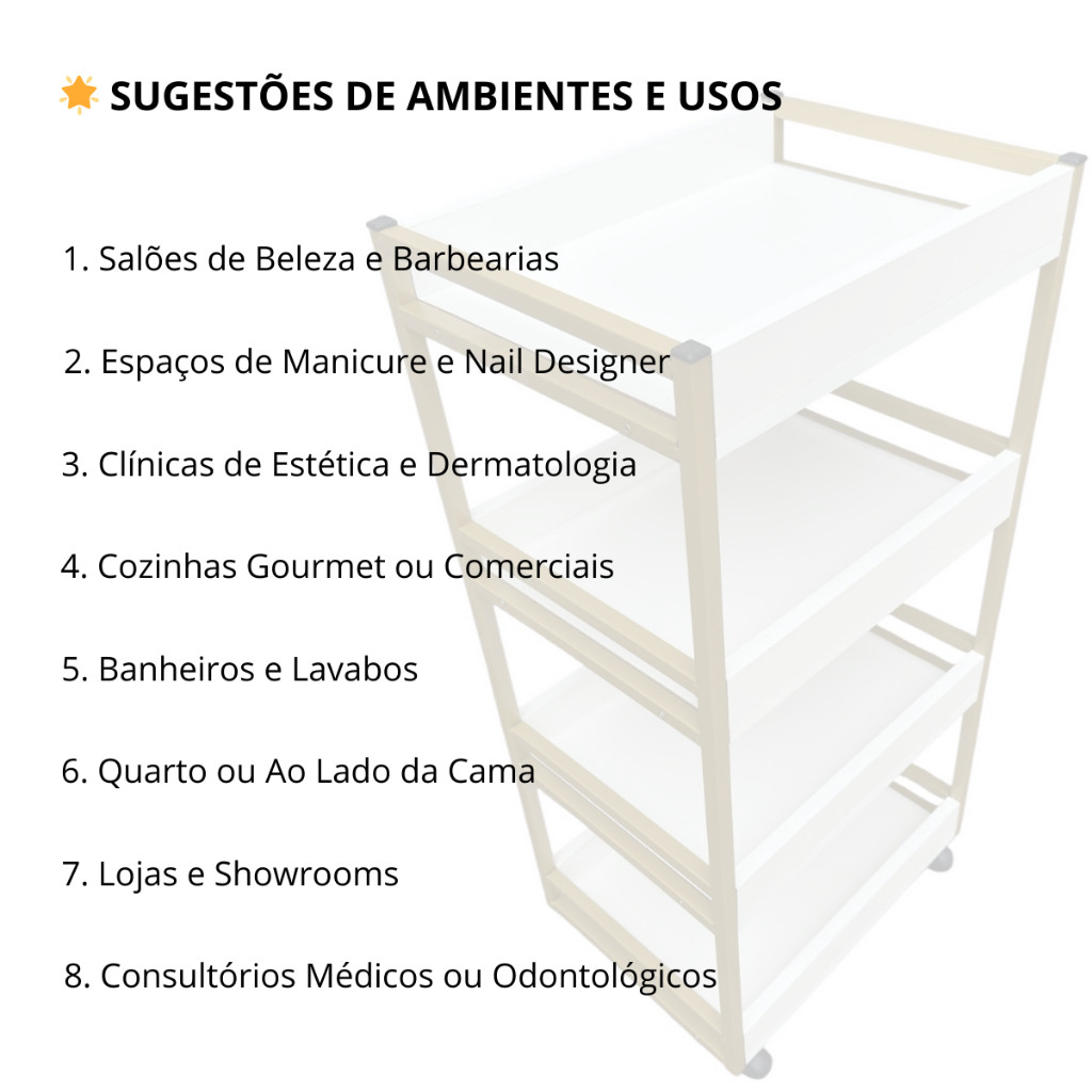 Carrinho Auxiliar 4 Bandejas – Estrutura Metalon + MDF – 80cm de Altura – 5 Cores Disponíveis O Carrinho Auxiliar 4 Bandejas é a solução ideal para quem busca funcionalidade, durabilidade e um toque moderno na decoração. Com estrutura robusta em aço metalon 15x15mm e prateleiras em MDF 15mm, este carrinho oferece armazenamento inteligente e facilidade de transporte graças às rodinhas inclusas. Características do Produto _Estrutura: Aço metalon 15x15mm com pintura eletrostática _Prateleiras: MDF 15mm com acabamento liso e fácil limpeza _Bandejas: 4 unidades amplas para maior capacidade _Altura de cada bandeja: 22 cm _Rodinhas: Inclusas para fácil movimentação _Cores disponíveis: Dourado, Preto, Branco, Prata, Rose Gold Medidas Aproximadas *Altura total: 80 cm *Largura: 40 cm *Profundidade: 30 cm *Altura interna das bandejas: 22 cm Aplicações Salões de Beleza e Barbearias Espaços de Manicure e Nail Designer Clínicas de Estética e Dermatologia Cozinhas Gourmet ou Comerciais Banheiros e Lavabos Quartos ou Laterais de Cama Lojas e Showrooms Consultórios Médicos ou Odontológicos Conteúdo da Embalagem 1 Carrinho auxiliar com 4 bandejas Rodinhas giratórias Kit de parafusos Manual de montagem 🚚 Envio rápido e seguro para todo o Brasil
