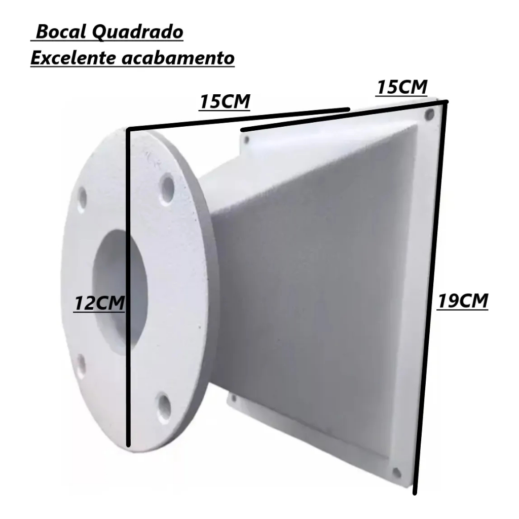 Cone Para Driver Corneta Trio Som Carro Aluminio 2 UNIDADES Perfeita para garantir melhor desempenho e muita qualidade para seu projeto de som, a Corneta Curta é indicada para ser usada junto com drivers em caixas trio, caixas acústicas e em seu som automotivo. Feita em alumínio fundido, ela garante o melhor direcionamento do som para que você possa curtir sua experiência sonora com maior performance. Características: - Material: Alumínio - Formato: Curta Quadrada - Bocal de parafuso Modelo Disponível: - Branco/ Preto Especificação Técnica: - Bocal Quadrado - Excelente acabamento - Ideal para utilizar com Driver em Caixas Trio - Diâmetro da Garganta: 2' - Diâmetro da Boca: 19 por 15cm - Profundidade Aproximada: 15,2cm - Altura: 18,9cm - Largura: 15,1cm