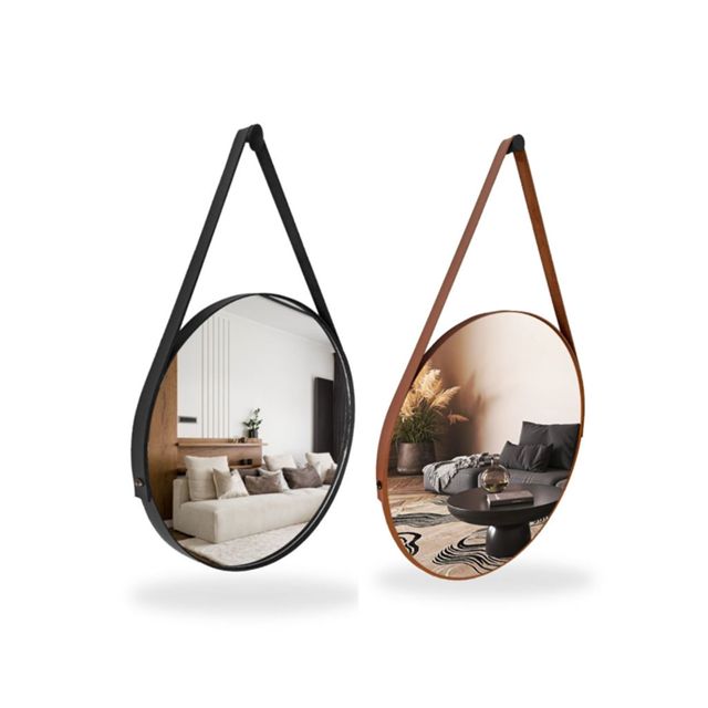 2 Espelho Adnet 40cm Sala Quarto Banheiro Alça Couro / Preto e Caramelo