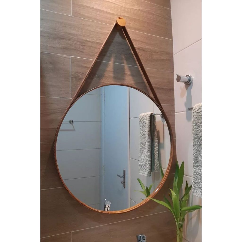 Espelho Redondo Decorativo Adnet 50 CM com alça de couro. Espelho Belga 3mm Lapidado Acompanha Alça de couro Sintético e Pino de Madeira. Disponível nas cores Preto, Caramelo e Café. Espelho decorativo redondo modelo Adnet com alça em couro legítimo, espelho genuíno primeira linha sem distorções e acabamento feito com superprecisão.