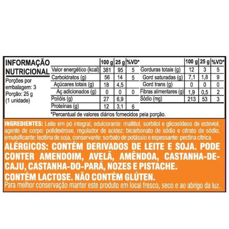 2 Fondant de Leite Zero Açúcar 75g Cada - DaColônia -Não Contém Glúten -Zero adição de açúcar -Livre de Gordura Trans Ingredientes: Leite em pó integral, Maltitol, Sorbitol, Soro de leite em pó, Lecitina de soja, Gordura Vegetal de Palma, Sorbato de potássio INS 202, Citrato de Sódio, Bicabornato de sódio, pectina cítrica, aroma doce de leite e sucralose. Alérgenos: Não contém glúten, contém Leite, derivados do leite e derivados de soja. Validade: 6 meses a partir da data de fabricação.