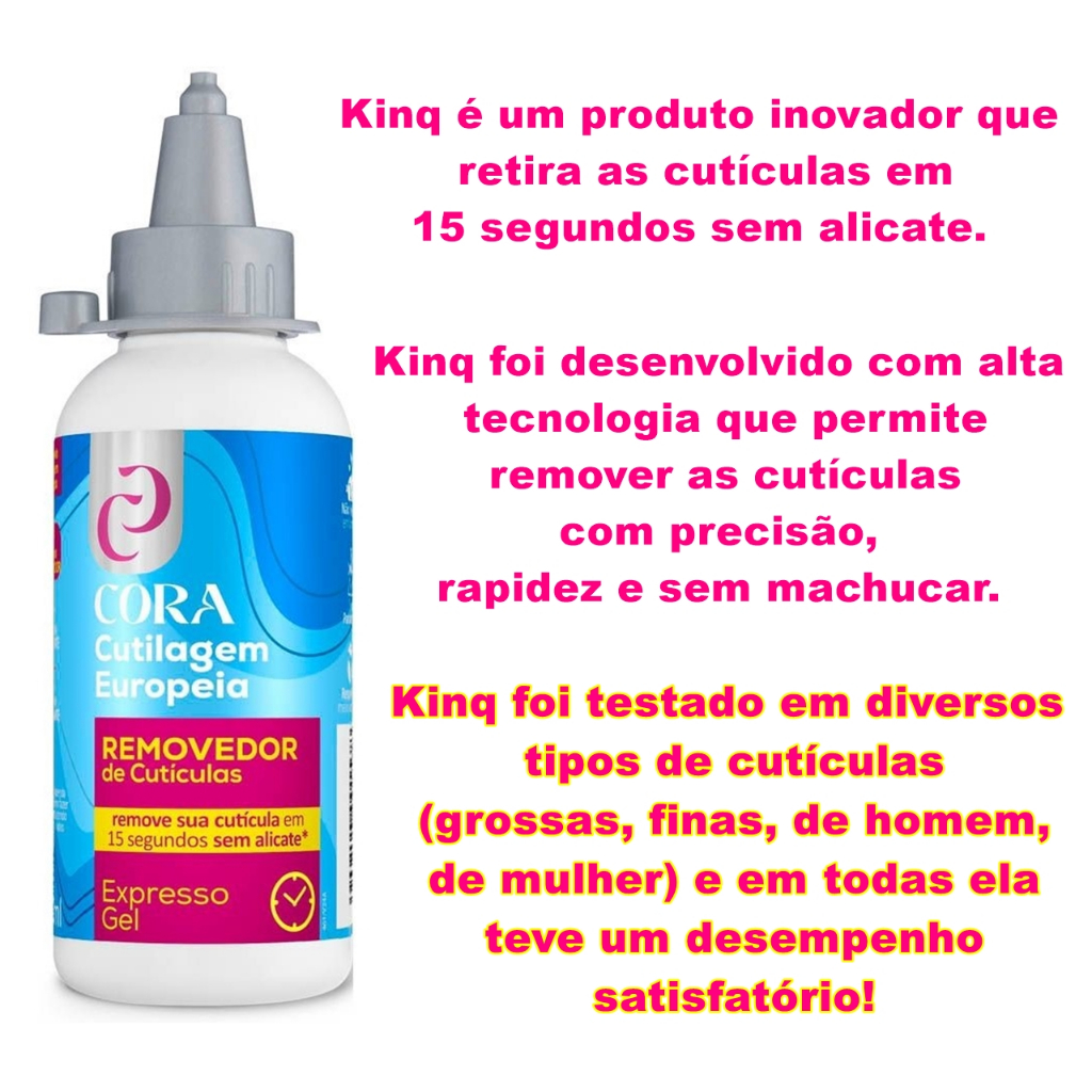 Bem vindos ao nosso anúncio! COMPOSIÇÃO: 2 Kinq Removedor Gel Expresso Aplicador 100ml - CORA Remove sua cutícula em 15 segundos sem alicate. O que é? Kinq é um produto inovador que retira as cutículas em 15 segundos sem alicate. Como funciona? É só passar o Kinq em todas as cutículas de uma mão ou de um pé, contar 15 segundos e depois retirar as cutículas com uma espátula. É mágica? Não, Kinq foi desenvolvido com alta tecnologia que permite remover as cutículas com precisão, rapidez e sem machucar. É 100% eficaz mesmo sem alicate? Kinq foi testado em diversos tipos de cutículas (grossas, finas, de homem, de mulher) e em todas elas Kinq teve um desempenho satisfatório mesmo sem o uso do alicate, porém dependendo da cutícula e do gosto de cada pessoa pode ser necessário o uso do alicate. Removedor de Cutículas Dermatologicamente Testado. Versão em Gel para uma aplicação precisa. Aguardamos sua compra!!!!