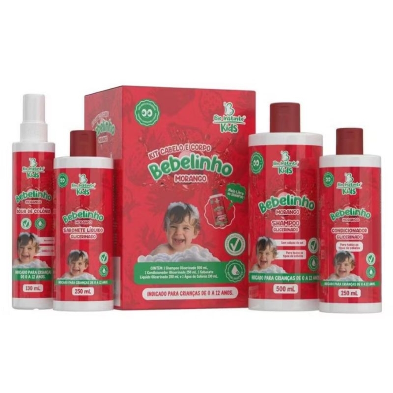 O Kit Bebelinho Bio Instinto Kids Algodão Doce foi desenvolvido especialmente para cuidar com carinho da pele e dos cabelos das crianças de 0 a 12 anos. Com fórmula glicerinada, suave e dermatologicamente testada, é perfeito para um banho seguro, divertido e cheio de amor. O que vem no kit? Shampoo Glicerinado 500mL – Limpa delicadamente sem agredir os fios. Condicionador Glicerinado 250mL – Desembaraça e hidrata, deixando os cabelos macios e perfumados. Sabonete Líquido Glicerinado 250mL – Limpeza suave para a pele sensível das crianças. Água de Colônia 130mL – Fragrância suave de algodão doce, perfeita para finalizar os cuidados diários. Benefícios e Diferenciais: Dermatologicamente testado e seguro para uso infantil. Fórmula suave, livre de sal e corantes. Indicado para crianças de 0 a 12 anos.