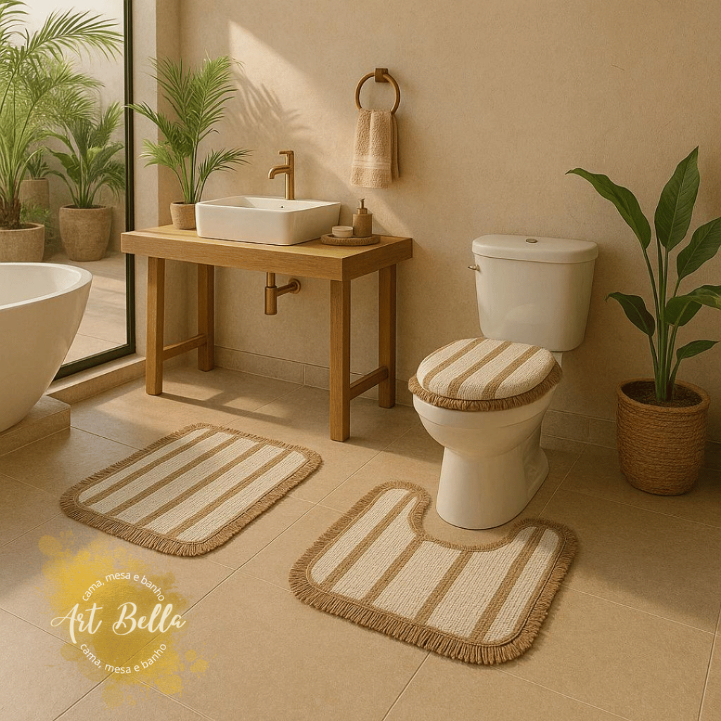 2 Kits Tapete Banheiro com 3 peças algodão Premium Jogo de Banheiro Decoração listras com franja