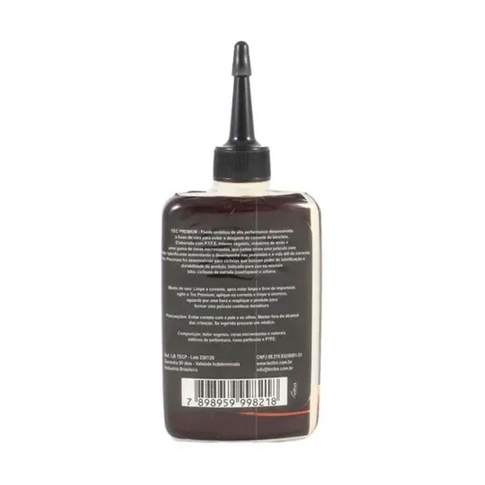 Lubrificante Corrente Cera Tec Premium P.T.F.E – 90ml O Lubrificante de Corrente Cera Tectire Premium é uma cera de corrente, feito para resistir às condições mais exigentes, mantendo a corrente limpa e diminuindo o ruído da relação, fricção e atrito. Em condições secas, o Lubrificante Bike Tectire Premium é extremamente durável e uma aplicação serve para um treino inteiro protegendo toda a transmissão de qualquer desgaste e reduzindo a fricção, permitindo o aumento da performance e menor desgaste das peças. O Lubrificantes Correntes Cera Tectire Premium também é 100% biodegradável e livre de solventes. Elaborado com P.T.F.E, ésteres vegetais, redutores de atrito e uma gama de ceras micronizadas, que juntos criam uma película com caráter lubrificante aumentando o desempenho nas pedaladas e a vida útil da corrente. Indicado para uso no moutain bike, ciclismo de estrada (road/speed) e urbano. Características - Reduz a fricção permitindo o aumento da performance - 100% biodegradável - Impede o acumulo de sujeira na corrente - Impede o desgaste precoce da transmissão - Contém matérias primas inovadoras Mais informações Sobre o produto: - Composição: Éster vegetal, ceras micronizada e naturais, aditivos de performance, nano partículas e PTFE - Conteúdo: 90 ml - Modelo: Tec Premium Cera P.T.F.E – 90ml - Produto: Nacional - Marca: Tectire