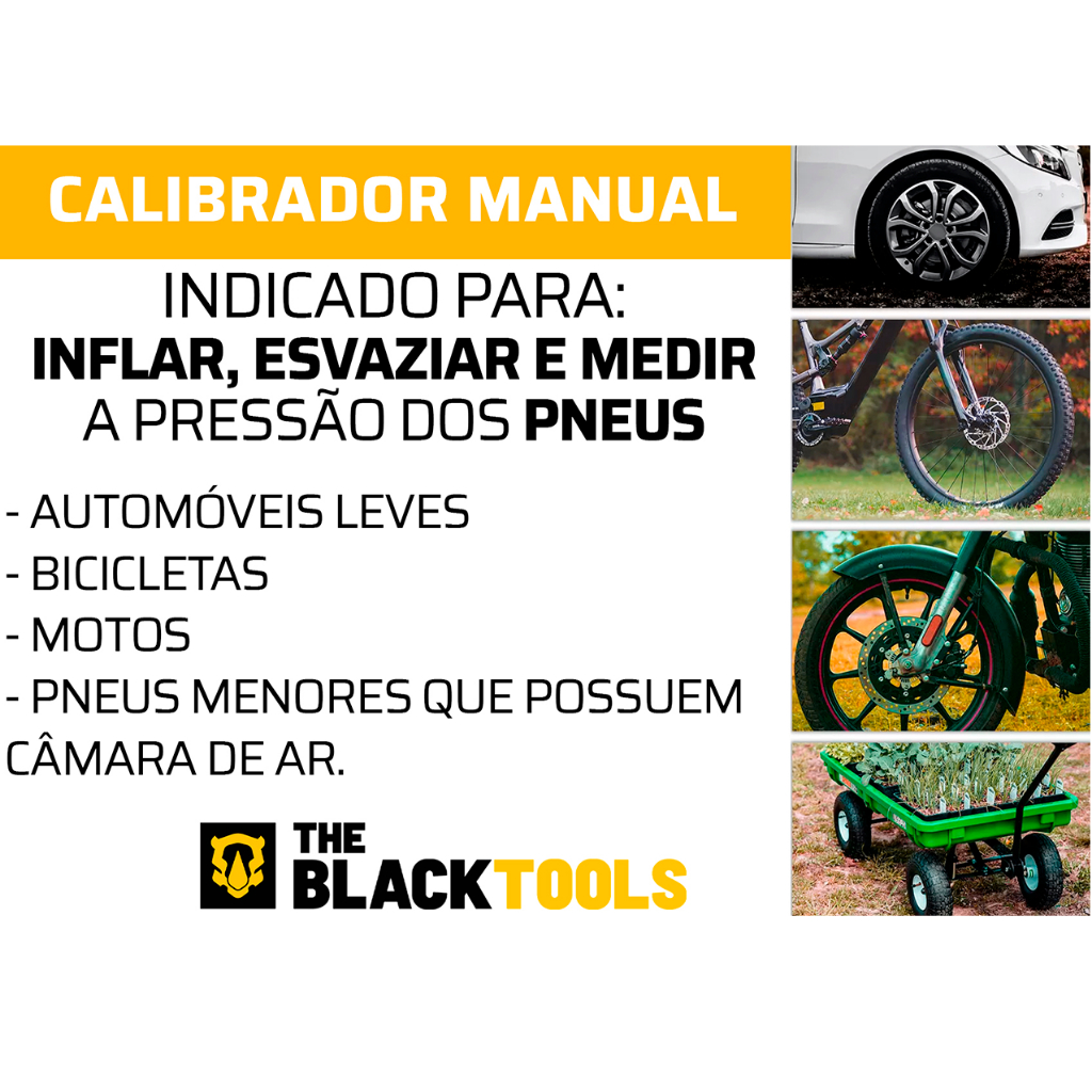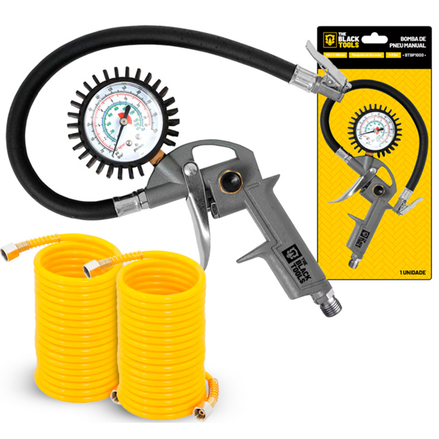 A The Black Tools é uma marca comprometida com a qualidade e as necessidades do cliente. Nosso objetivo é oferecer as melhores soluções para o seu dia a dia, com um design funcional e inovador. CALIBRADOR E INFLADOR DE PNEUS COM MANÔMETRO MANUAL BTBP1000 - The Black Tools Calibrador e Inflador De Pneus Pneumático Com Manômetro Manual BTBP1000 da The Black Tools é uma ferramenta indispensável para quem busca praticidade e eficiência ao calibrar pneus. Produzida com materiais de alta qualidade, como alumínio resistente e mangueira de borracha flexível, garante durabilidade e precisão. Com manômetro integrado, permite o monitoramento exato da pressão dos pneus, assegurando maior segurança e economia para o seu veículo. VANTAGENS: - Construção robusta e materiais resistentes para longa durabilidade; - Alta precisão no monitoramento da pressão com manômetro integrado; - Fácil de usar, com bico prendedor e trava para operação prática; - Possui válvula de alívio de pressão para ajustes rápidos. IDEAL PARA: - Pneus com câmaras de ar de borracha; - Bicicletas; - Carros; - Motos. FICHA TÉCNICA: - Manômetro: Integrado para monitoramento preciso; - Mangueira: Flexível, em borracha resistente; - Pressão: 0 a 8 BAR (até 220 PSI); - Material: Alumínio e borracha; - Válvula de alívio de pressão; - Bico prendedor com trava; - Rosca: M10 (1-365 mm). Marca: The Black Tools Modelo: BTBP1000 + Mangueira Espiral Fêmea 7,5 m 1/4 Polegadas A Mangueira Espiral Fêmea 7,5 m 1/4 Polegadas é indicada para redes de ar comprimido de baixa pressão (máximo 150 libras), proporcionando praticidade de manuseio e melhor organização. Por que a linha Mangueira Poliuretano Espiral Amarela 1/4" Fêmea 7,5 metros é a melhor do mercado?Com fácil instalação, acompanha conexões de encaixe, 7,5 metros de comprimento, proporcionando maior alcance em suas aplicações e formato espiral, garantindo praticidade e melhor organização.Onde posso usar a linha Mangueira Poliuretano Espiral Amarela 1/4" Fêmea 7,5 metros?Para aplicações com pressão máxima de 150 libras a mangueira é indicada para redes de ar comprimido de baixa pressão. Especificações Técnicas: - Diâmetro externo da mangueira: 8 mm - Diâmetro interno da mangueira: 5 mm - Cor da mangueira: Amarela - Material da mangueira: Poliuretano + PVC - Pressão máxima de trabalho da mangueira (PSI): 150 lbf/pol² - Medida da rosca das conexões da mangueira: 1/4" - NPT fêmea - Comprimento da mangueira: 7,5 m SKU: KIT24472_24119x2