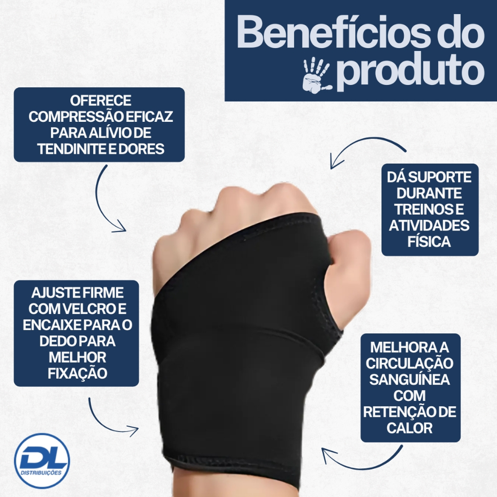 Está buscando alívio imediato para dores nos punhos e maior segurança durante seus treinos? Características do Produto: - Itens: 2 Munhequeiras - Composição: 75% Espuma de Neoprene e 25% Nylon - Design: Modelo bilateral que serve tanto para a mão direita quanto para a esquerda, com encaixe anatômico para o dedo polegar e ajuste por velcro - Tamanho: Comprimento total de 36 cm, largura de 10 cm, espessura do tecido de 0,4 cm e diâmetro do encaixe do dedão de 1,7 cm - Funcionalidade: Proporciona compressão, estabilidade e retenção de calor, auxiliando na melhora da circulação sanguínea - Compatibilidade: Ideal para homens, mulheres e crianças Por Que Escolher Este Produto? - Previne lesões e alivia dores causadas por tendinite, artrite ou movimentos repetitivos - Melhora a estabilidade das articulações durante treinos e atividades físicas - Mantém a região aquecida, proporcionando alívio terapêutico para dores musculares e articulares. Dicas de Uso: - Utilize durante treinos, atividades esportivas ou no dia a dia para prevenir ou aliviar dores no pulso - Solta a cinta e posicione o polegar na área de travamento em volta do pulso - Traga a alça elástica para frente nas costas da mão. Enrole em volta do pulso e aperte bem Perguntas Frequentes (FAQs): - O produto serve para as duas mãos? Sim, o modelo é bilateral, podendo ser usado na mão esquerda ou direita. - O envio é imediato? Sim, temos o produto disponível para pronta entrega e envio imediato. - Como faço a limpeza? Não lavar, não utilizar alvejante, não lavar a seco e evitar a lavagem com água. Não perca a oportunidade de garantir mais conforto e segurança para o seu dia a dia. Adquira agora o seu par de munhequeiras e sinta a diferença! Garantia do vendedor: 30 dias