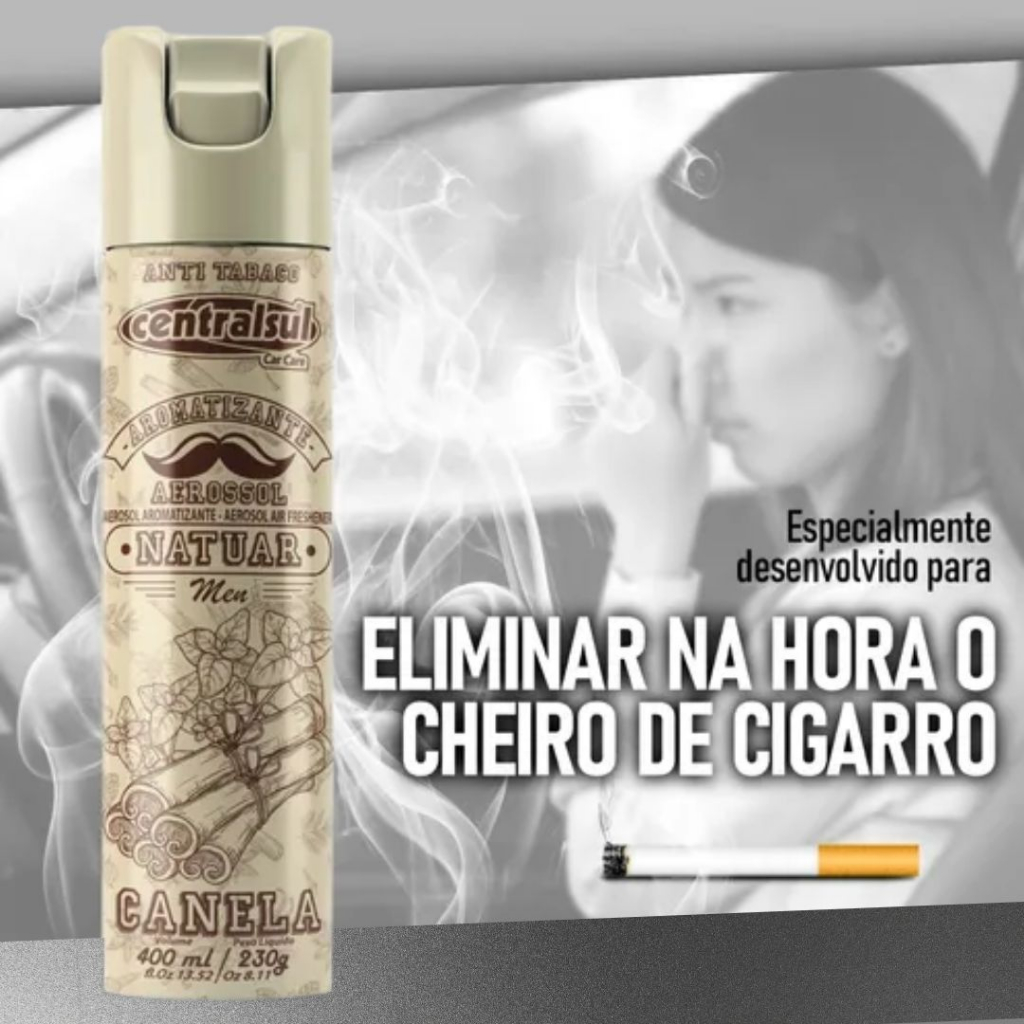 KIT COM 2 Neutralizador de Odores antitabaco VANTAGENS Formulado especialmente para eliminar o mau odor deixado após o uso de cigarros dentro de veículos. Deixa no ambiente uma fragrâncias de canela. Combate também odores de mofo. MODO DE USAR Agitar a embalagem, remover a tampa e aplicar dentro do veículo ou ambiente desejado. APLICAÇÕES Pode ser utilizado em veículos ou ambientes domésticos.
