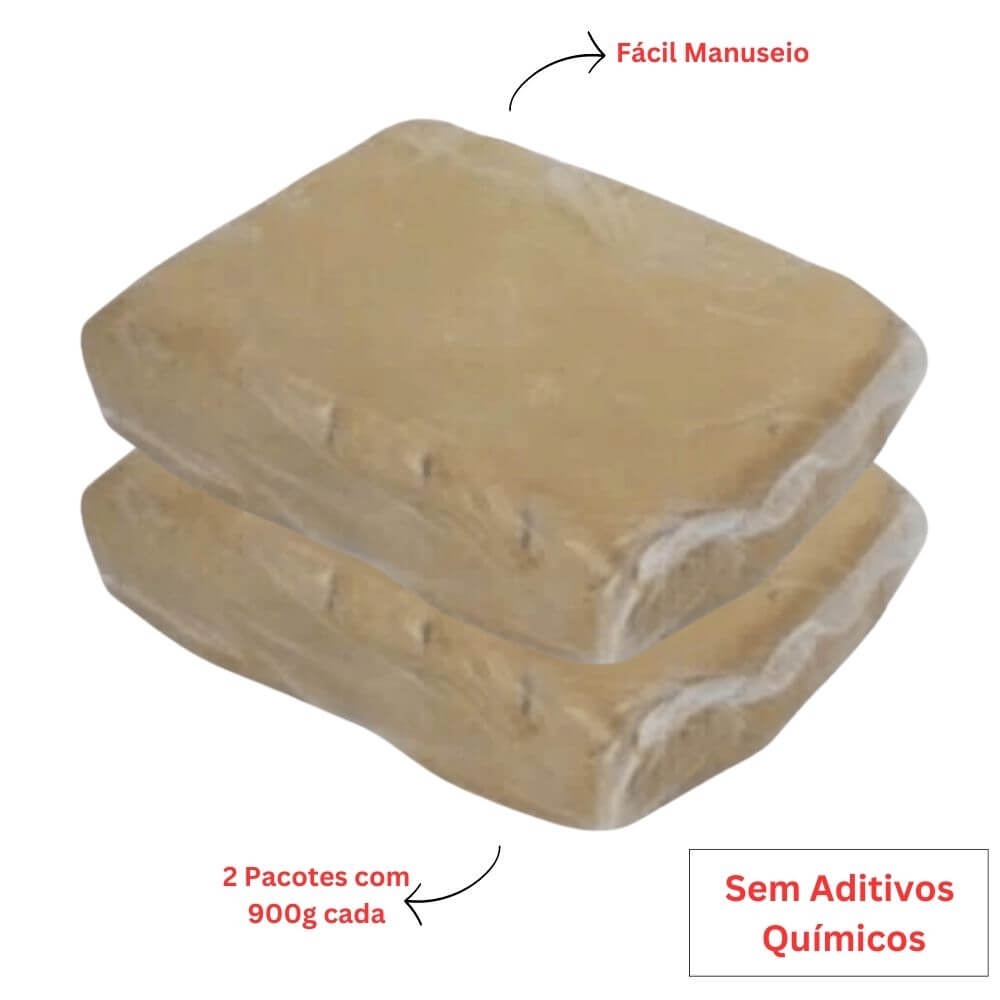 KIT COM 2 UNIDADES DE 900G DE ARGILA PARA ARTESANATO E TRABALHOS ESCOLARES Material natural de fácil manuseio. Ideal para trabalhos artesanais e escolares. A secagem em temperatura ambiente é de aproximadamente duas semanas, mas pode variar de acordo com o clima da região. Não é recomendado a secagem em forno. Material natural sem aditivos químicos.