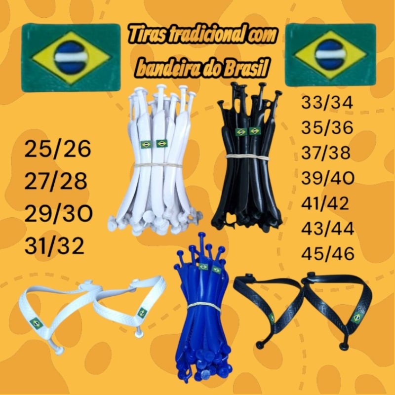 Tiras chinelo com bandeira Brasil Realizar compra indique o tamanho desejado no chat temos tamanhos 33/34 35/36 Deixamos escolher cor e 37/38. Tamanho variados temos 39/40. Cores branca preta e azul 41/42 43/44 infantil temos cor branca e preto 25/26 27/28 29/30 31/32 Correia tiras de chinelos havaianas com bandeira Brasil com logomarca escrito correia resistente e duradouras ao realizar compra nós informe chat cor e tamanho desejado TAMANHOS 33/34 35/36 37/38 39/49 41/42 43/44 cores da foto Azul, branca e preto obrigado pela preferência qualquer dúvida pode perguntar chat vendemos em maior quantidade pacote 10 pares vc pode escolher cores e tamanhos várias no pacote de 10 Pares precisando só entrar em contato
