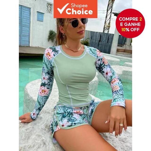 2 Peças Roupa De Banho Proteção Solar Terno De Mergulho Impresso Boxer Shorts Manga Longa Maiô Para Mulher