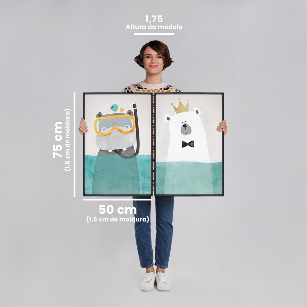 2 Quadros Decorativo Infantil Aventura Submersa: Hipopótamo Mergulhador e Urso Polar Real com Moldura 50x75 com e sem vidro A imagem apresenta uma dupla encantadora de quadros decorativos, cada um destacando um animal adorável em um cenário divertido e colorido. O primeiro quadro à esquerda apresenta um hipopótamo cinza que está usando um óculos de mergulho amarelo e um snorkel preto. Acima da cabeça do hipopótamo, há dois pássaros: um verde e um laranja. A parte inferior do quadro mostra uma área azul que sugere água, indicando que o hipopótamo está parcialmente submerso. A cena combina um toque humorístico com a ideia de um hipopótamo mergulhador e pássaros companheiros. O segundo quadro à direita exibe um urso polar branco que está usando uma coroa dourada e uma gravata borboleta preta. Assim como o hipopótamo, a parte inferior do quadro também apresenta uma área azul que sugere água, indicando que o urso polar também está parcialmente submerso. A combinação de elementos como a coroa e a gravata borboleta confere uma aparência nobre e elegante ao urso polar, criando um contraste curioso e divertido. Esses quadros utilizam cores suaves e detalhes simples, tornando as ilustrações encantadoras e perfeitas para decorar ambientes infantis ou descontraídos. A mistura de humor e criatividade na representação desses animais em situações antropomorfizadas e inusitadas acrescenta um charme especial às obras. Material da Imagem: Papel fotográfico premium. Material da Moldura: Madeira de reflorestamento revestida em preto. Dimensões: 50cm de largura e 75cm de comprimento. Acompanha: Suporte de serrilha Acabamento: Fita kraft. Destaques: Design atemporal, alta qualidade de imagem e moldura, certificado FSC de manejo florestal