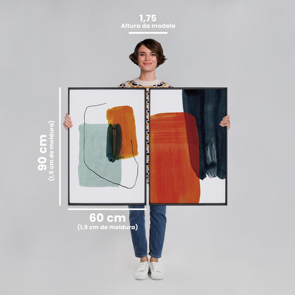 2 Quadros Decorativos Abstrato Geometrico Jogo de Tons e Formas com Moldura Com Moldura Quarto Sala Escritorio Quadros Decorativos Abstrato Geometrico Jogo de Tons e Formas com Moldura Com Moldura Quarto Sala Escritorio 50x75 e 60x90 com e sem vidro Conjunto composto de dois quadros apresenta uma composição abstrata moderna e minimalista. O quadro à esquerda exibe um fundo branco com uma grande imagem retangular em tom de verde claro, sobreposta por uma forma laranja e uma linha preta sinuosa que atravessa a composição. O quadro à direita complementa o conjunto com uma grande forma laranja vibrante, acompanhada por uma faixa preta vertical que se estende do topo ao meio da tela. As cores quentes e frias se equilibram, criando uma sensação de harmonia e contraste visual. Este conjunto é ideal para adicionar um toque contemporâneo e sofisticado a qualquer ambiente. Material da Imagem: Papel fotográfico premium. Material da Moldura: Madeira de reflorestamento revestida em preto. Dimensões: 60cm de largura e 90cm de comprimento. Acompanha: Suporte de serrilha Acabamento: Fita kraft. Destaques: Design atemporal, alta qualidade de imagem e moldura, certificado FSC de manejo florestal Material da Imagem: Papel fotográfico premium. Material da Moldura: Madeira de reflorestamento revestida em preto. Dimensões: 50cm de largura e 75cm de comprimento. Acompanha: Suporte de serrilha Acabamento: Fita kraft. Destaques: Design atemporal, alta qualidade de imagem e moldura, certificado FSC de manejo florestal
