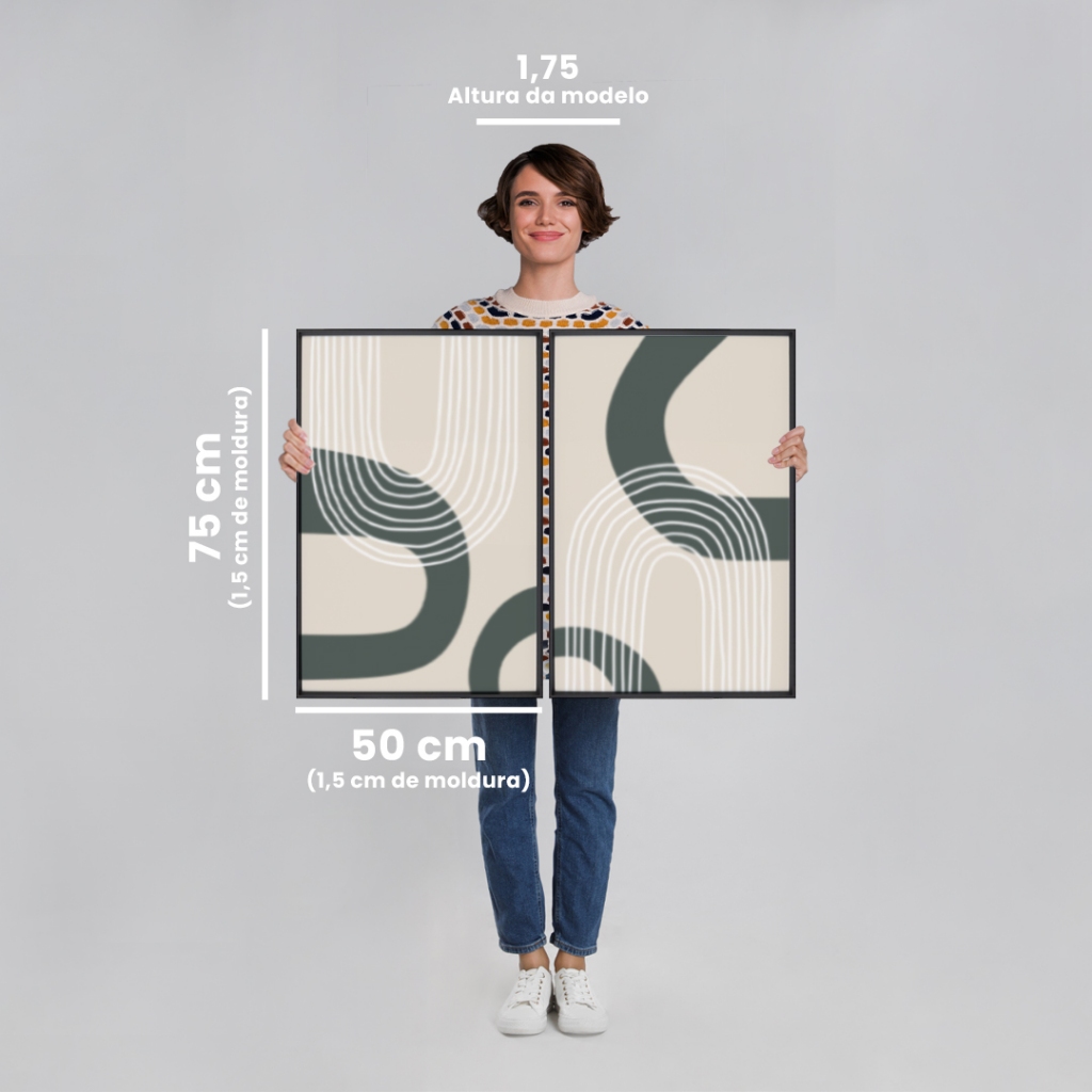 2 Quadros Decorativos Abstrato Geometrico Sintonia entre Linhas com Moldura Quarto Sala Escritorio Quadros Decorativos Abstrato Geometrico Sintonia entre Linhas com Moldura Quarto Sala Escritorio 50x75 e 60x90 com e sem vidro Conjunto composto por duas telas, cada uma com um design abstrato que utiliza linhas curvas e formas geométricas. As linhas são predominantemente brancas e cinzas, criando um contraste suave e elegante. As formas parecem se conectar entre as duas telas, formando um padrão contínuo que atrai o olhar e cria uma sensação de movimento e harmonia. Este tipo de arte abstrata é interessante porque permite múltiplas interpretações e pode complementar diversos estilos de decoração, adicionando um toque moderno e sofisticado ao ambiente. Material da Imagem: Papel fotográfico premium. Material da Moldura: Madeira de reflorestamento revestida em preto. Dimensões: 60cm de largura e 90cm de comprimento. Acompanha: Suporte de serrilha Acabamento: Fita kraft. Destaques: Design atemporal, alta qualidade de imagem e moldura, certificado FSC de manejo florestal Material da Imagem: Papel fotográfico premium. Material da Moldura: Madeira de reflorestamento revestida em preto. Dimensões: 50cm de largura e 75cm de comprimento. Acompanha: Suporte de serrilha Acabamento: Fita kraft. Destaques: Design atemporal, alta qualidade de imagem e moldura, certificado FSC de manejo florestal