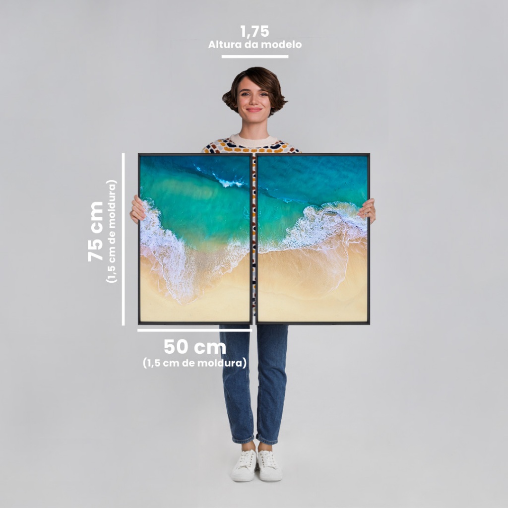 2 Quadros Decorativos Paisagem Vista Aerea Praia com Belas Ondas Com Moldura Quarto Sala Escritorio Esses dois quadros, formam uma composição deslumbrante de uma praia paradisíaca. A cena captura o encontro entre o mar azul-turquesa e a areia clara, com ondas suaves acariciando a costa.Criando uma sensação de tranquilidade e liberdade. Ideal para salas de estar, quartos ou escritórios, estes quadros trazem um toque de frescor e conexão com a natureza, transformando qualquer ambiente em um espaço relaxante e elegante. Material da Imagem: Papel fotográfico premium. Material da Moldura: Madeira de reflorestamento revestida em preto. Dimensões: 60cm de largura e 90cm de comprimento. Acompanha: Suporte de serrilha Acabamento: Fita kraft. Destaques: Design atemporal, alta qualidade de imagem e moldura, certificado FSC de manejo florestal Material da Imagem: Papel fotográfico premium. Material da Moldura: Madeira de reflorestamento revestida em preto. Dimensões: 50cm de largura e 75cm de comprimento. Acompanha: Suporte de serrilha Acabamento: Fita kraft. Destaques: Design atemporal, alta qualidade de imagem e moldura, certificado FSC de manejo florestal