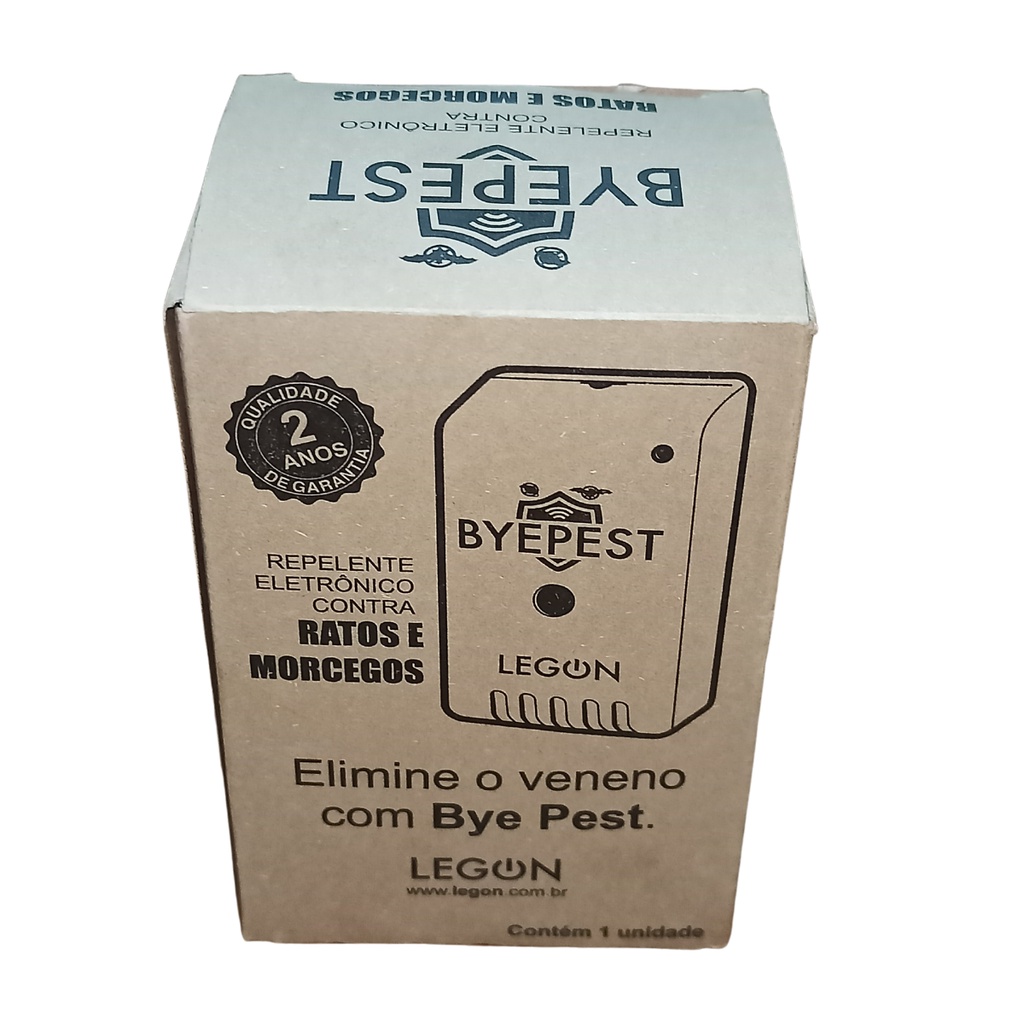 Repelente Eletrônico Morcegos e Ratos ByePest Alcance 200m² ByePest é um repelente eletrônico fabricado pela Legon, ecologicamente correto e que auxilia a reduzir a quantidade de Ratos e Morcegos no ambiente. Dicas de uso: Para eliminar morcegos, use-o na parte superior da área. Para eliminar ratos, use-o na parte inferior da área. Mantenha a área livre (sem objetos na frente do repelente). O Repelente ByePest deverá ficar ligado 24 horas por dia para melhores resultados. Mantenha ligado mesmo com o desaparecimento das pragas. AVISO IMPORTANTE INSTALAÇÃO DO BYEPEST O aparelho deve ser instalado no local onde se encontram as pragas (ratos e ou morcegos) O ultrassom não ultrapassa barreiras Para que o aparelho tenha a sua eficiência é preciso que o local não tenha atrativos para essas pragas, como comida, sujeira, ração, etc. O BYEPEST é indicado apenas para ÁREAS INTERNAS, não tendo muita eficácia se instalado em ambiente externo onde possa ter impossibilidade do sinal sonoro ecoar e incomodar as pragas com o sinal sonoro. O incômodo as pragas pode ocorrer entre 1-3 semanas, como existem vários fatores que influenciam em um bom resultado (local, temperatura, umidade, quantidade de pragas, atrativos para as pragas permanecerem no ambiente mesmo com o incomodo sonoro), se não tiver resultado em até 3 semanas, você terá a opção de devolver por arrependimento, onde será gerado uma autorização de postagem. Seu princípio de funcionamento está baseado na emissão de sinais sonoros não audíveis pelos seres humanos, mas que incomodam os ratos e morcegos, fazendo com que eles saiam do local. Repelentes químicos convencionais fazem uso de produtos tóxicos que podem causar alergias ou mesmo intoxicação quando não são manuseados corretamente. Por ser um repelente ultrassônico (utilizando apenas sons), o aparelho não precisa de refil, o que significa que não produz cheiro e também não faz uso de nenhum produto químico. Espantar ratos e morcegos será totalmente inofensivo às pessoas e aos animais domésticos. As principais características do repelente eletrônico ByePest são: • Não tóxico • Bivolt (127v ou 220v) • Antialérgico • Não tem cheiro • Não agride o meio ambiente • Não utiliza refil • Botão de teste • Atua em ambientes de até 200m² • Uso por tempo indeterminado • Inofensivo a animais domésticos • Baixo consumo de energia (0,5 watts) Indicado para uso residencial.