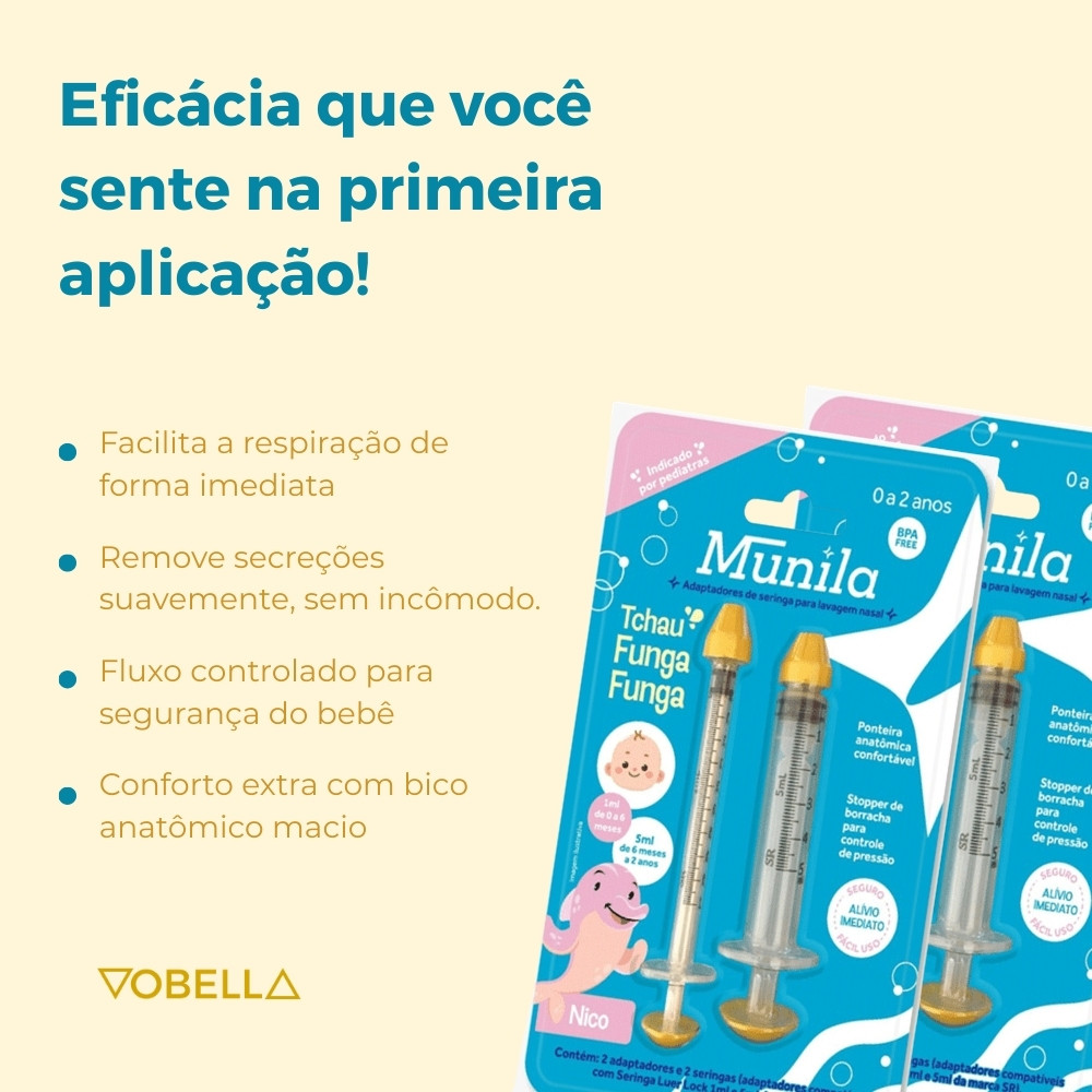 Com design anatômico, fácil de usar e indicado por pediatras, o kit com 2 Seringas de Lavagem Nasal Munila traz mais conforto na hora da higienização das vias respiratórias. Ideal para aliviar congestão e manter uma rotina de cuidados suave e eficiente, desde os primeiros dias de vida. Por que comprar o 2 Seringas Lavagem Nasal 2 Adaptadores Bebê Infantil Munila? O produto é perfeito para quem busca um método simples e eficaz de fazer lavagem nasal em bebês e crianças. Acompanha adaptadores confortáveis, seringas práticas e stopper de borracha que ajuda a controlar a pressão. Tudo isso em um kit seguro, higiênico e reutilizável. Sobre o produto: -2 Seringas Lavagem Nasal 2 Adaptadores Bebê Infantil. -Marca: Munila. -Indicado por pediatras. -Seguro e fácil de usar. -Dois adaptadores anatômicos nasais. -Duas seringas resistentes. -Stopper de borracha para controle de pressão. -Ajuda na lavagem nasal e alívio da congestão. -Proporciona conforto e bem-estar diário. -Recomendado para rotina de higiene nasal. Indicado para: -Crianças de 0 a 2 anos. -Uso com soro fisiológico. -Situações de resfriado, rinite ou congestão nasal. Modo de uso: -Encha o dispositivo com soro fisiológico. -Com a boca aberta, incline o corpo para frente e a cabeça levemente para o lado. -Posicione o adaptador em uma narina e pressione lentamente até o soro sair pela outra. -Repita o processo conforme orientação médica. Precauções: -Utilize sob orientação médica ou de um especialista. -Não compartilhe o uso entre diferentes pessoas. -Use sempre com supervisão de um adulto. -Substituir após 6 meses de uso. -Consulte profissional para ajustar intensidade do fluxo. Com formato anatômico, seguro e aprovado por especialistas, o 2 Seringas Lavagem Nasal 2 Adaptadores Bebê Infantil Munila é a escolha certa para tornar esse cuidado essencial mais prático e tranquilo. Garanta agora mesmo o seu! Surgiu alguma dúvida? Entre em contato com a gente! Boas Compras :)