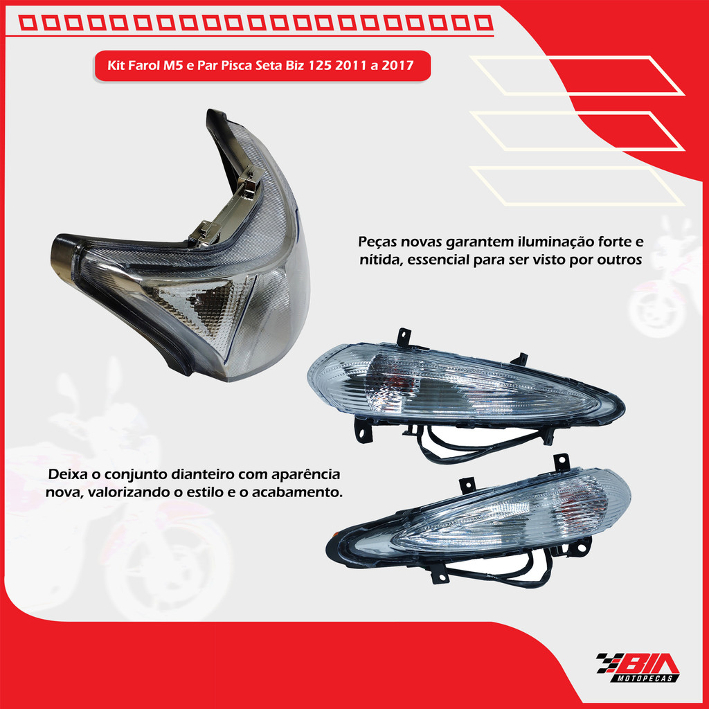 Kit Bloco Óptico M5 E Par Pisca Cristal Modelo Original Motos Compatíveis: Honda Biz 125 2011 a 2017 Honda Biz 100 2011 a 2017 Produtos que irá receber: 1 Farol M5 1 Pisca Seta Esquerdo 1 Pisca Seta Direito Produto fabricado com as mesmas especificações e padrão de qualidade originais, garantindo uma instalação perfeita, sem necessidade de adaptações. Peças ideais para quem busca restaurar a moto em caso de colisões ou quedas, quando, geralmente, estas peças são as mais afetadas, com ótimo custo benefício.