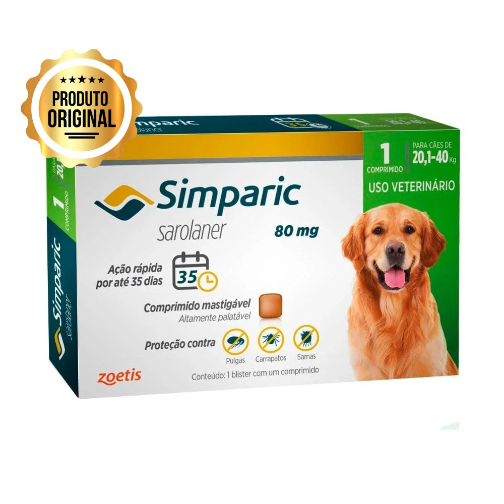 – Indicado para cães;– Kit com 2 Simparic de 10,1 a 20kg e 1 Simparic de 20,1 a 40kg;– Controle de pulgas e carrapatos;– Combate também três tipos de sarnas: Sarcópticas, Demodécica e Otodécica;– Começa a agir rapidamente; efeito a partir de 3 horas;– Comprimido mastigável. O Antipulgas e carrapatos Simparic foi desenvolvido para combater as indesejadas pulgas e carrapatos, mantendo sua eficácia por até 35 dias. O simparic ajuda também a combater até três tipos de sarna a Sarcópticas, Demodécica e Otodécica, tem fácil aceitação pelos cachorros pois os comprimidos são palatáveis e saborosos. O antipulgas é ideal para cães a partir de 8 semanas de idade, é importante administrar o comprimido conforme o peso corpóreo do pet.Modo de usarAdministrar via oral, 1 comprimido por mês. Simparic é um comprimido mastigável, sendo altamente palatável, podendo ser administrado com o sem alimentos. Sua fórmula age contra as pulgas resistentes, pode ser utilizado como parte do tratamento estratégico para controle de dermatite alérgica a picada de pulgas (DAPP).