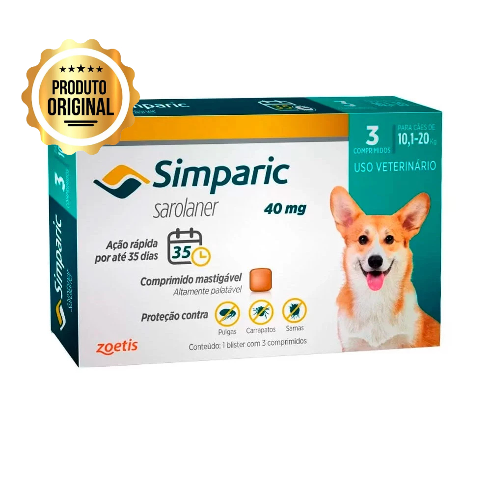 – Indicado para cães;– Kit com 2 Simparic de 20,1 a 40kg e 1 Simparic de 10,1 a 20kg;– Controle de pulgas e carrapatos;– Combate também três tipos de sarnas: Sarcópticas, Demodécica e Otodécica;– Começa a agir rapidamente; efeito a partir de 3 horas;– Comprimido mastigável. O Antipulgas e carrapatos Simparic foi desenvolvido para combater as indesejadas pulgas e carrapatos, mantendo sua eficácia por até 35 dias. O simparic ajuda também a combater até três tipos de sarna a Sarcópticas, Demodécica e Otodécica, tem fácil aceitação pelos cachorros pois os comprimidos são palatáveis e saborosos. O antipulgas é ideal para cães a partir de 8 semanas de idade, é importante administrar o comprimido conforme o peso corpóreo do pet.Modo de usarAdministrar via oral, 1 comprimido por mês. Simparic é um comprimido mastigável, sendo altamente palatável, podendo ser administrado com o sem alimentos. Sua fórmula age contra as pulgas resistentes, pode ser utilizado como parte do tratamento estratégico para controle de dermatite alérgica a picada de pulgas (DAPP).