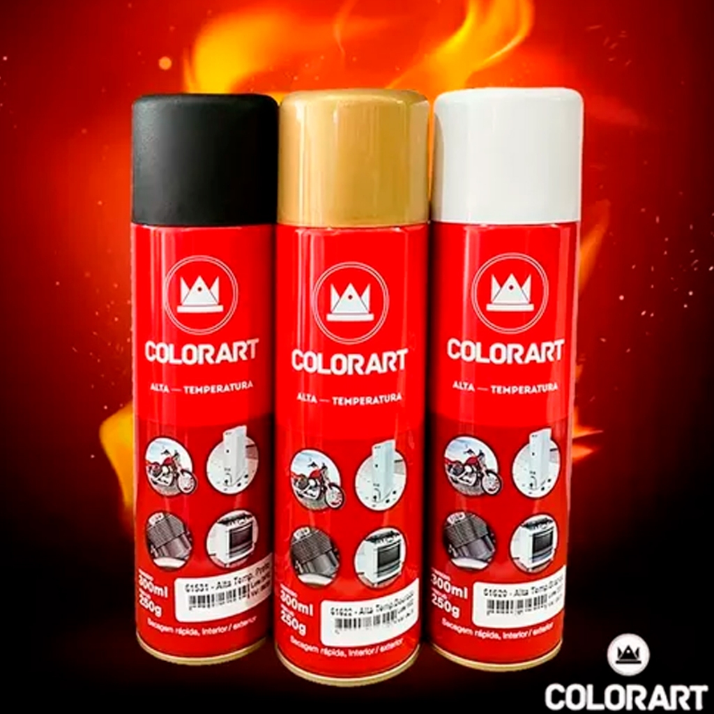 02 Unidades Tinta Spray Alta Temperatura Vermelho Motor Pinça 600ºcTINTA ALTA TEMPERATURA VERMELHA COLORART - É uma tinta em spray especial para metais que atinjam altas temperaturas como escapamentos de carros e motos, churrasqueiras, lareiras, aquecedores, exaustores,motores, pinças de freio, fogões, fornos, etc. Resistente a temperaturas de 300°C contínuos (direto) ou até 600°C por períodos curtos (indireto). Aplicar em temperatura ambiente, cura mínima indicada 12 horas também em temperatura ambiente. Secagem rápida para toque em menos de 10 minutos (Pode variar em função de temperatura/umidade).Especificações:Fabricante: ColorArtPeso Liquido: 250gConteúdo: 300mlSeca em 30 minutos para manuseio, enquanto a cura total ocorrerá quando a temperatura atingir 150°CExemplos de Aplicação:- Motores;- Escapamentos;- Churrasqueiras;- Lareiras;- Aquecedores;- Estufas;- Fogões;- Fornos.