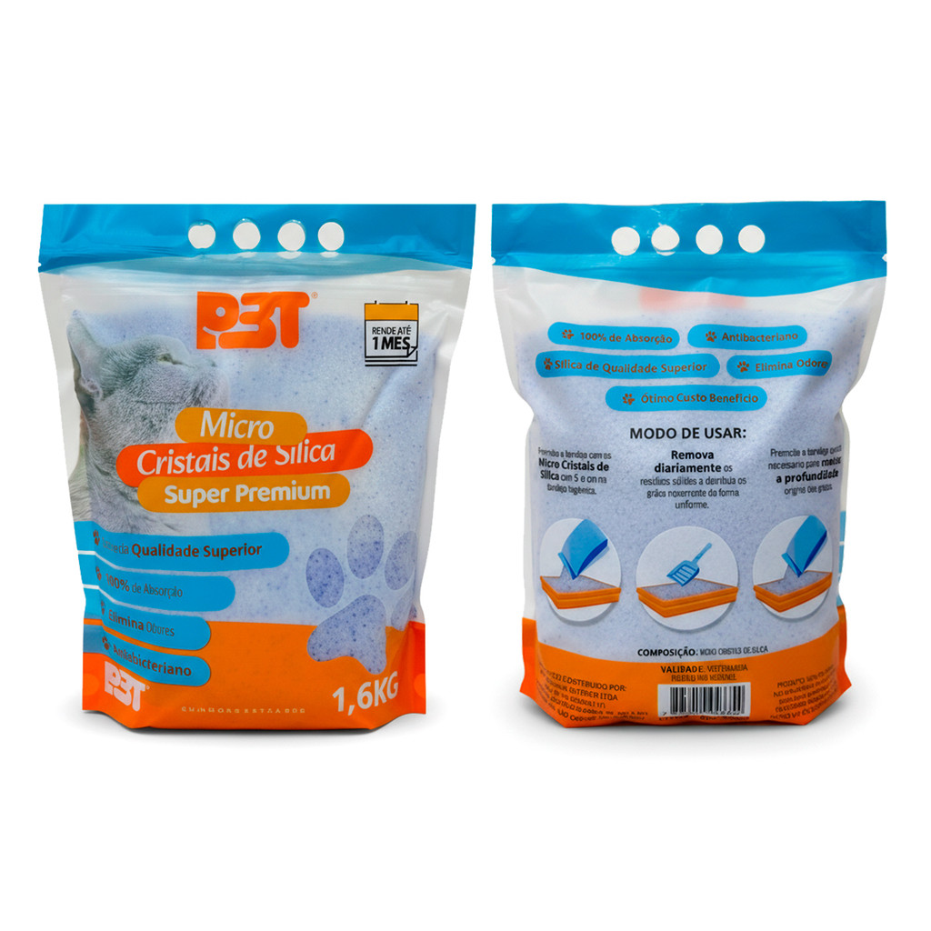 2 UN Areia Sanitária de Gato Micro Cristais Sílica FINA 3,2kg P3T Cada Pacote de 1,6 Kg de areia de cristais, de duração estimada em 1 mês. Neutraliza odores, absorve a urina, inibe a proliferação de fungos e bactérias. Custo-benefício excelente, produto de uso diário e indispensável para a higiene de sua casa. Os gatos são animais higiênicos até mesmo quando necessitam defecar ou urinar. Para proporcionar ao seu animal toda a limpeza e praticidade que ele merece para suas necessidades a Chalesco desenvolve areias especiais com sílica. Esta areia é de altíssima absorção com cristais de sílica. CARACTERÍSTICAS DO PRODUTO: Indica tempo de troca e controla odores e possui melhor custo benefício; Produto seguro e bem aceito pelos gatos; Cada pacote rende no mínimo 1 mês e é ideal para gatos criados dentro de residências. BENEFÍCIOS: Controla e elimina odores; Aceita pelos gatos; Melhor custo benefício; Antialérgica. MODO DE USO: Preencha a bandeja do seu gato com uma camada de 5 a 7 cm de areia. Remova diariamente os resíduos utilizando uma pá apropriada. Complete a bandeja com mais areia conforme necessário para manter sempre a altura recomendada. Faça a troca total do conteúdo e a limpeza completa da bandeja pelo menos uma vez por mês, ou conforme a necessidade. Descarte os resíduos de acordo com as recomendações locais.