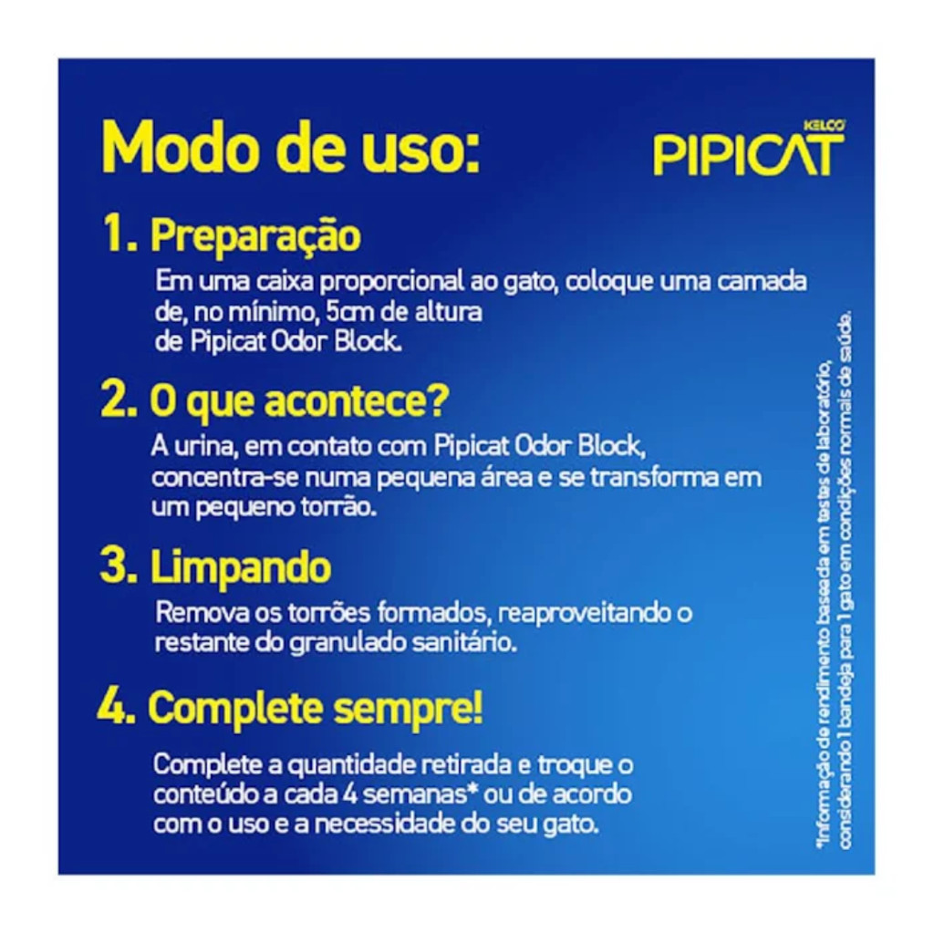 2 Pacotes de 4 kg De Areia Sanitária Pipicat Classic para Gatos - Você receberá o total de 8 kg de Areia Sanitária Pipicat Classic para Gatos - Sem fragrância; - Grãos médios; - Forma torrões que facilitam a limpeza; - Controle de odores superior com Pipicat Odor Block. A Areia Sanitária Kelco Pipicat Classic possui grânulos médios que garantem a retenção da urina e controle do mau cheiro, além de formar torrões concentrados e resistentes que facilitam a remoção. Possui cheiro e cor natural de terra que atraem o instinto do gato. Modo de Uso: - Coloque uma camada de 5cm de altura de Pipicat Classic no recipiente de uso do gato. - A urina, em contato com o granulado, concentra-se em uma pequena área, transformando-se em um pequeno torrão. - Remova o torrão formado pela urina ou fezes, reaproveitando o restante do produto. - Complete a quantidade retirada e troque inteiramente o conteúdo do recipiente a cada 4 semanas. - Não descartar no vaso sanitário. Cuidados: Quando houver mais de um gato, deve-se calcular uma bandeja e meia por gato e distribuí-las em diferentes locais da casa. A limpeza deve ser diária, eliminando os dejetos no dia ,evitando assim o mau cheiro. INDICAÇÃO Gatos IDADE Filhotes, Adultos, Idosos TAMANHO DA RAÇA Mini, Pequena, Média, Grande, Gigante CARACTERÍSTICAS DO PRODUTO Forma torrão COMPRA CONSCIENTE Natural TAMANHO DO GRÃO Médio TIPO DE AREIA Bentonita COMPOSICAO Argila Esmectita MARCA Pipicat