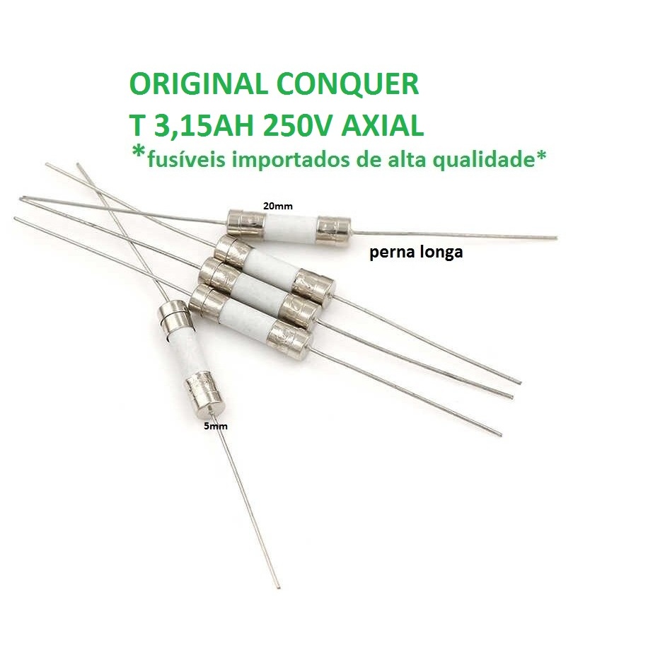 Original Conquer Fuses T 3,15ah 250v perna longa 5mm x 20mm Axial para solda **pacote com 2 peças ***PROMOÇÃO ***montamos anúncios para maior quantidade ou para mais produtos juntos e com descontos. ***chame o vendedor e mande seu pedido pra nós. (***ou mande os link’s dos produtos desejados***)