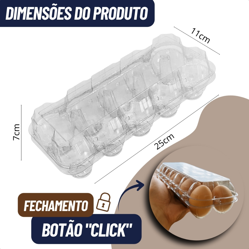 OLÁ SEJA BEM VINDO(A) À NOSSA LOJA! "AOS VENDEDORES" - FOTOS AUTORAIS E REGISTRADAS (BPP) - NÃO COPIE! PRODUTO COM NOTA FISCAL E GARANTIA "BLISTER PARA 10 OVOS" A embalagem plástica para ovos é ideal para armazenar, transportar e expor ovos com segurança e excelente apresentação no ponto de venda. Produzida em plástico transparente e resistente, permite a visualização do produto, valorizando sua aparência. Compatível com ovos de diferentes tamanhos (pequeno, grande, extra e jumbo), possui fechamento com botão “click”, garantindo firmeza e proteção durante o manuseio. DESCRIÇÃO: Material: Plástico Fechamento "Click" Quantidade de Cavidades: 10 APROVEITE O FRETE!!! Adicione mais produtos em seu carrinho!! Qualquer dúvida estamos à disposição no campo de perguntas.
