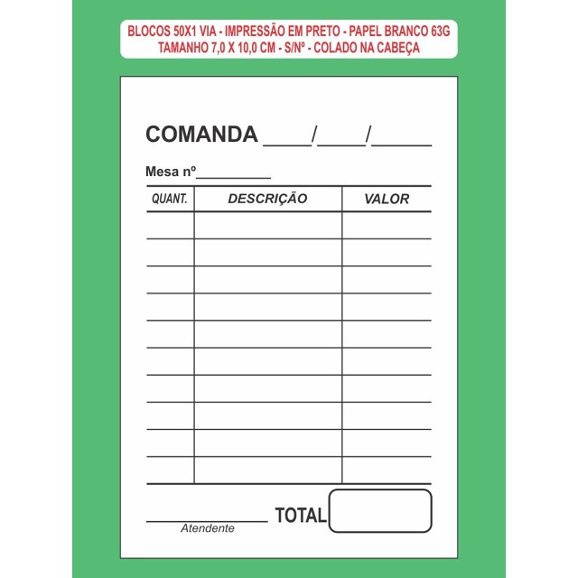 20 Blocos 50x1 De Comanda Mod Mesa S/n Pap Branco