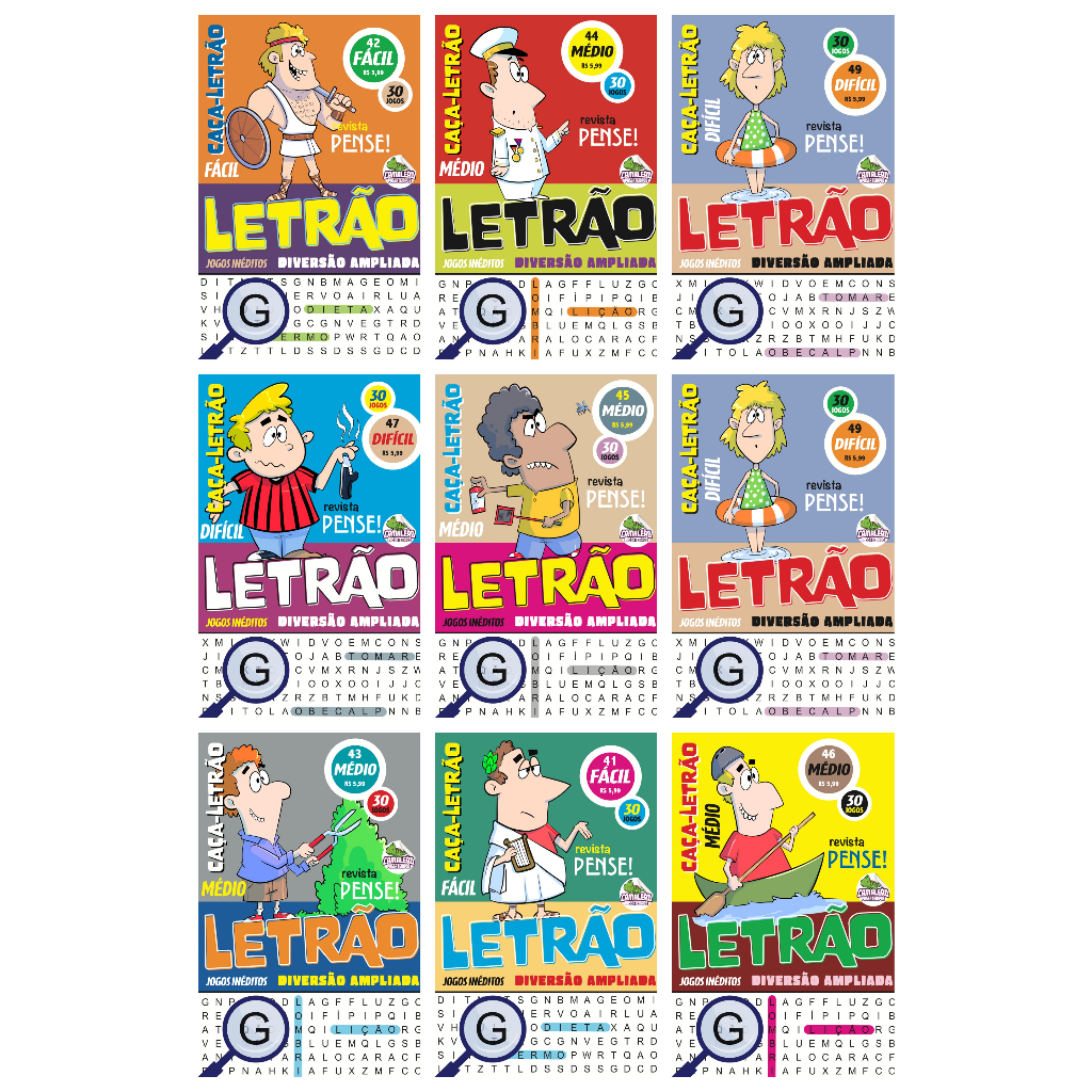 20 Caça Palavras Só Letra Grande Letrão - Sem Repetir Dimensões: 20 cm X 13,5 cm 34 páginas cada CAPAS MERAMENTE ILUSTRATIVAS Preço do anúncio refere-se a 20 revistas
