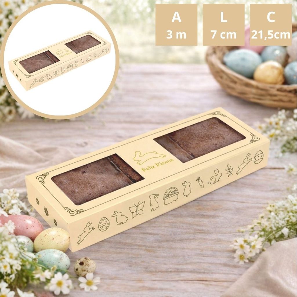 A Caixa para 3 Brownies da linha Páscoa Luz é moderna e refinada. Com acabamento em hot stamping ouro e visor transparente, valoriza doces e lembranças gourmet. Medidas cm (CxLxA) 21,5x7x3 Material Papel, Tinta e Plástico Sugestões de uso Ideal para brownies, cookies e doces artesanais. Diferenciais Acabamento em hot stamping ouro; Visor transparente e estrutura firme; Edição limitada e sofisticada.