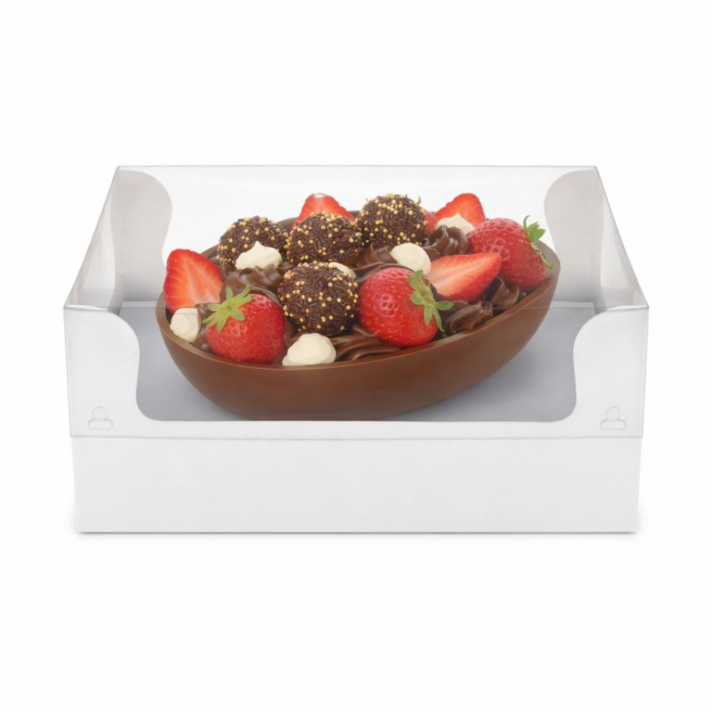 5 CAIXA PARA OVO DE PÁSCOA AJUSTÁVEL 100/150G BRANCA FUNDO E BERÇO EM PAPEL CARTÃO BERÇO DESTACÁVEL MEDIDAS COMPRIMENTO: 10cm LARGURA: 13cm ALTURA: 6,5cm