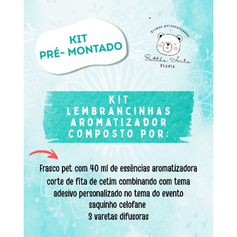 KIT LEMBRANCINHA AROMATIZADOR PERSONALIZADO. Neste kit cliente recebe: 20 frascos PET plástico de 40 ml com aroma a escolher 20 adesivos personalizados no tema desejado ( enviamos em tira. cliente finaliza corte) 60 varetas 20 saquinhos de celofane 20 corte de fita de cetim combinando ****KIT NÃO VAI MONTADO, CLIENTE FINALIZA A PARTE FINAL ( APLICAÇÃO DO RÓTULOS , COLOCAR NO SAQUINHO E DA o LACINHO) **** Aromas variados. Usamos aromas próprios para Aromatizadores. Temos variados Temas. *** No ATO PEDIDO , nos enviar via CHAT os dados do evento sendo o mais exato possível. **** Evento e data nomes que vão nas artes aroma desejado cores de preferência ou tema desejado. devido nosso prazo de produção ser mais rápido recomendamos a escolha de arte dentro do nosso catálogo de artes ( Enviamos modelos pelo chat para escolha). Assim que recebemos notificação do seu pedido e escolha do tema seu pedido entra em produção não sendo possível alterações. Nosso Ateliê atende os mais diversos eventos, estando no mercado de festas e lembranças há 13 anos. dúvidas, prazos entrar em contato no chat com vendedor. * todas as fotos anexas são de AUTORIA DE NOSSO ateliê, qualquer OUTRO USO fere a lei de direitos autorais. Nossas imagens estão protegidas pela lei de Direitos Autorais Lei nº 12.853, de 2013.