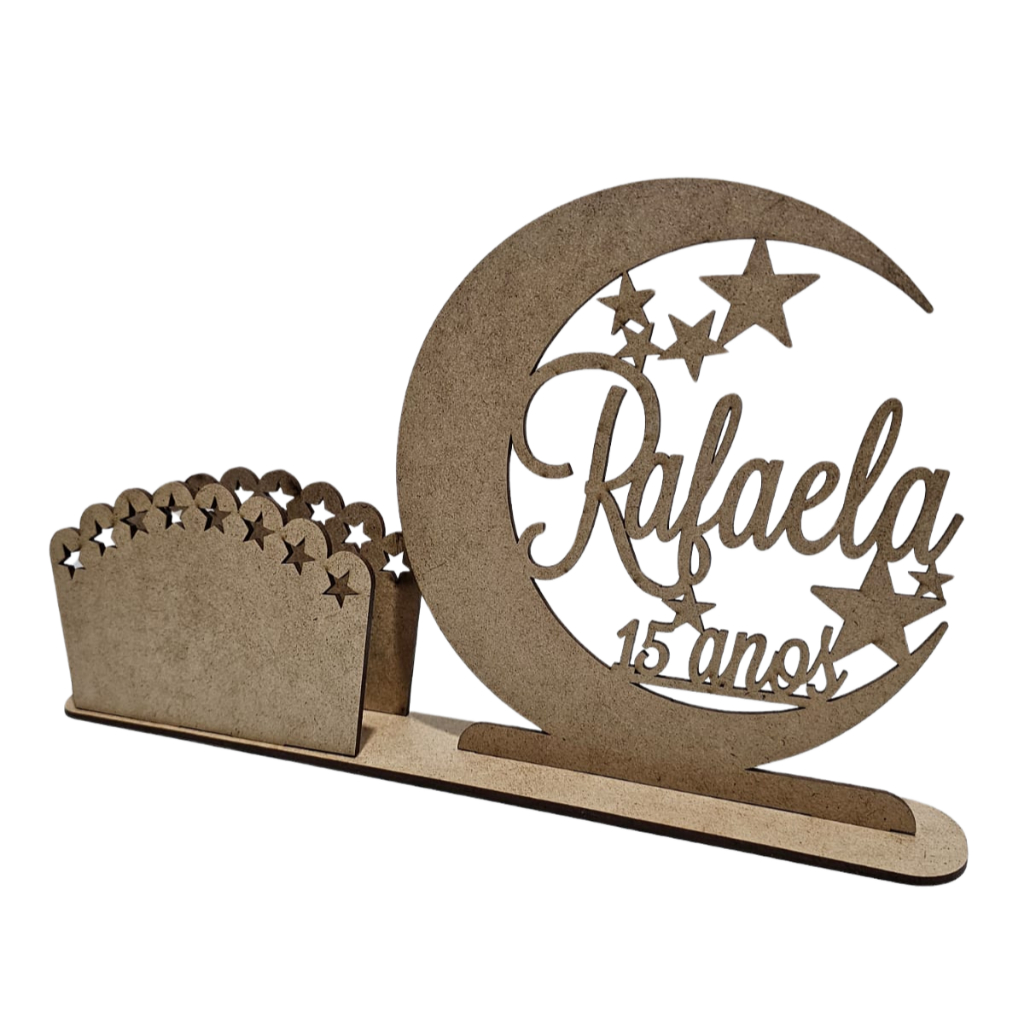 🌟 Detalhes do Produto: São 20 unidades Material: MDF cru de alta qualidade Personalização: Nome + Idade (ex: Rafaela – 15 anos) Tema: Lua e estrelas com recortes delicados Vai desmontado para facilitar o envio e reduzir o custo do frete Fácil de montar! Basta usar qualquer tipo de cola – até mesmo cola branca escolar Ideal como lembrancinha ou peça de decoração para mesas 📏 Medidas Aproximadas Montado: Largura: 30 cm Altura: 17 cm Profundidade: 4 cm 📦 Conteúdo da Embalagem: 10 Porta guardanapo em MDF desmontado, pronto para montagem 🎨 Dica: Você pode pintar, envernizar ou decorar com glitter, pérolas ou tinta PVA para combinar com a identidade visual da sua festa! 📝 Personalização: Após a compra, envie o nome e a idade desejados via chat para iniciarmos a produção!