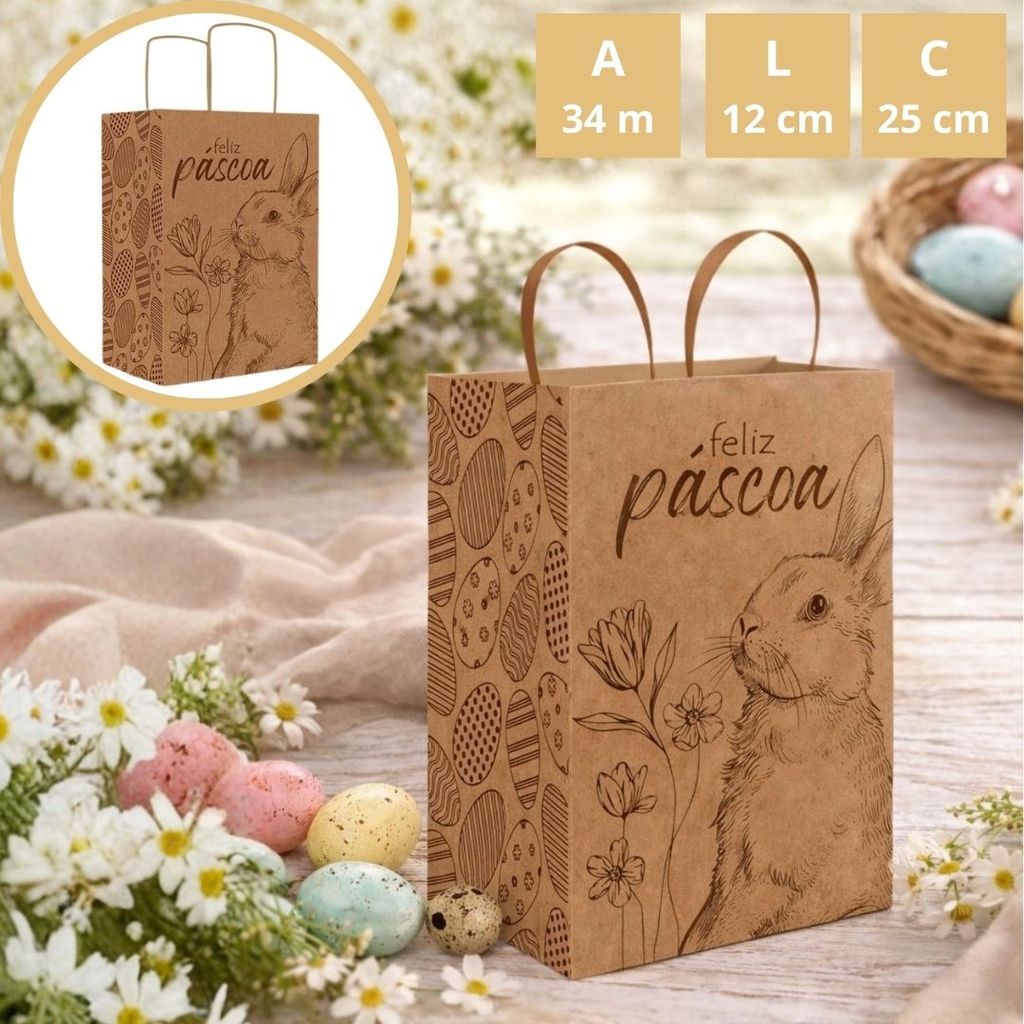 A Sacola Eco P da linha Páscoa Encantos une sustentabilidade e estilo. Com estrutura reforçada e design natural, é ideal para lembranças artesanais e pequenos presentes. Medidas cm (CxLxA) 25x12x34 Material Papel Kraft e Tinta Sugestões de uso Perfeita para doces, chocolates, mini arranjos ou cosméticos artesanais. Diferenciais Alça trançada; Papel kraft; Visual natural e moderno.